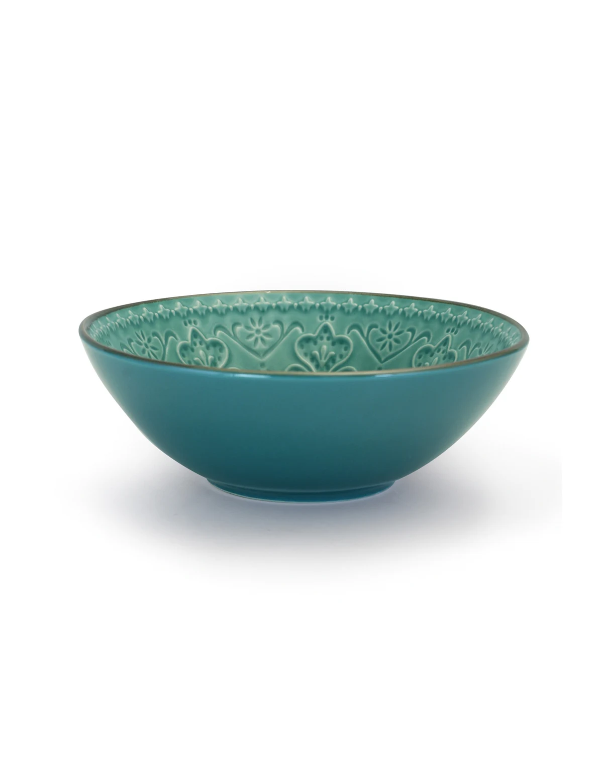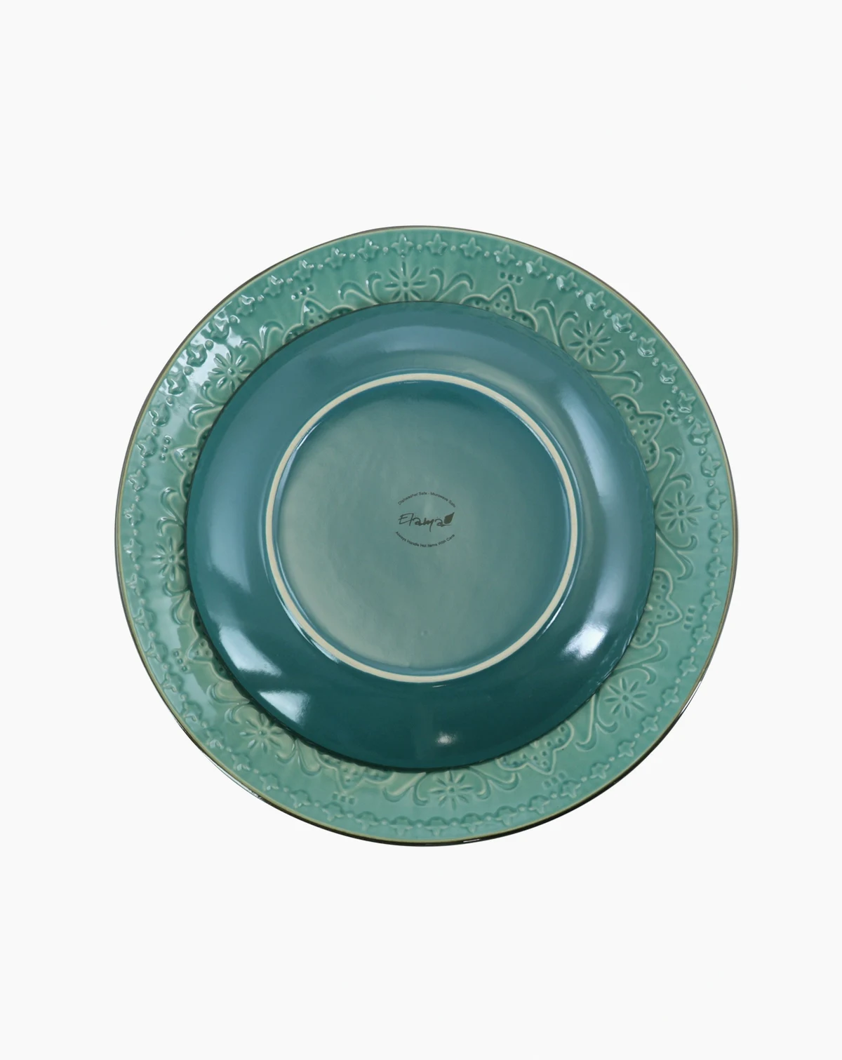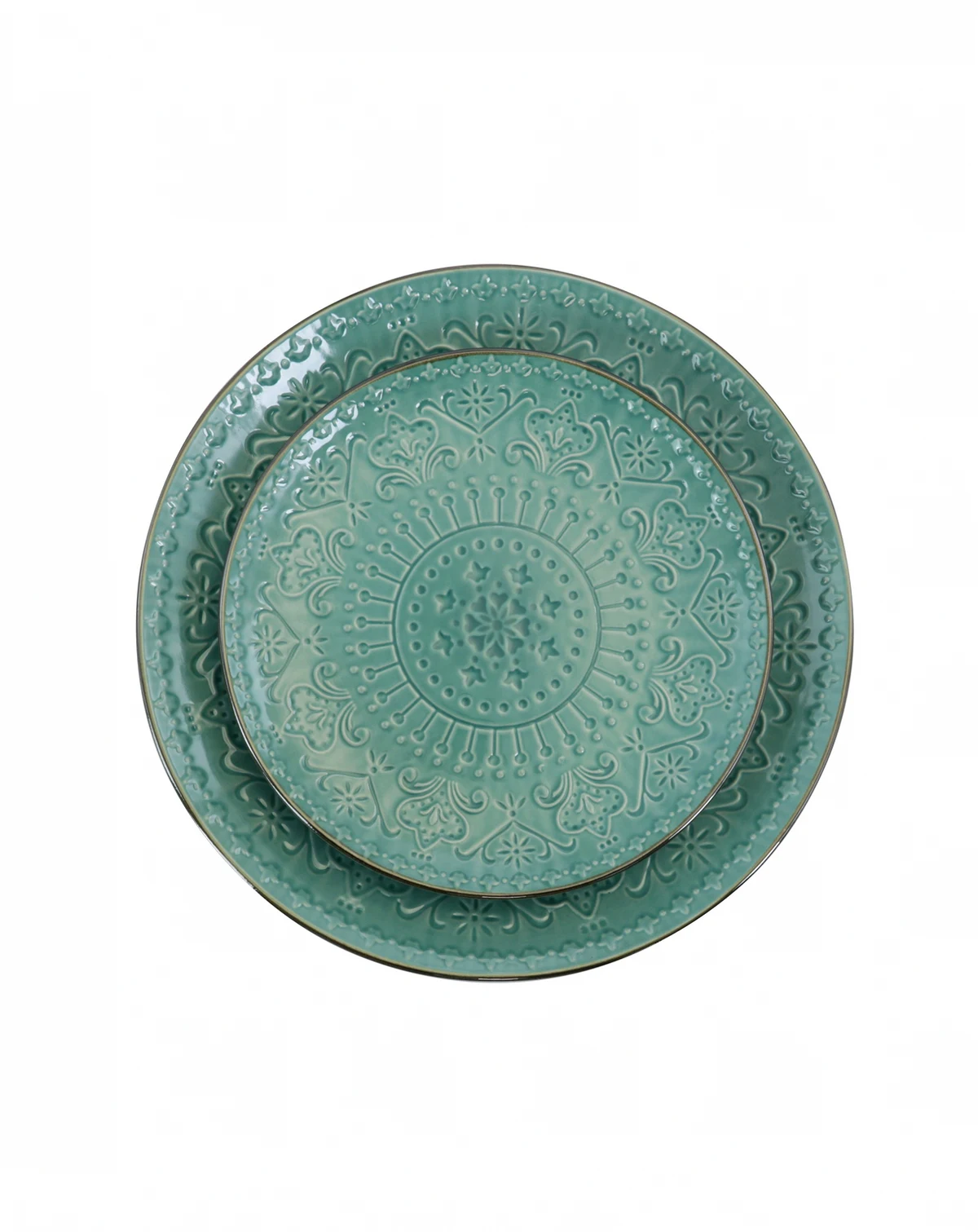 Freshen up your table setting with the textured 16 piece dinnerware set by Elama. With a calming tone of sea green and textured mandala style designed plates, this set is ready to make a statement at your next gathering.