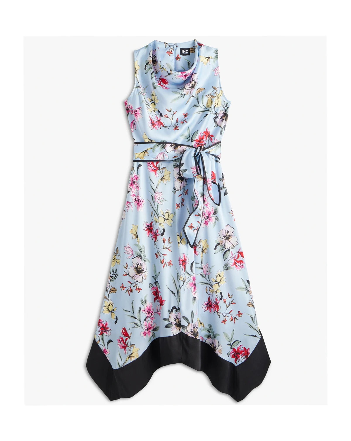 Take a twirl in this printed cowl-neck dress from I.N.C. International Concepts. Contrasting solid borders emphasize the unique handkerchief hem. ABOUT THE BRAND: I.N.C. is inspired by fabulous women—always bold, confident, and stylish.