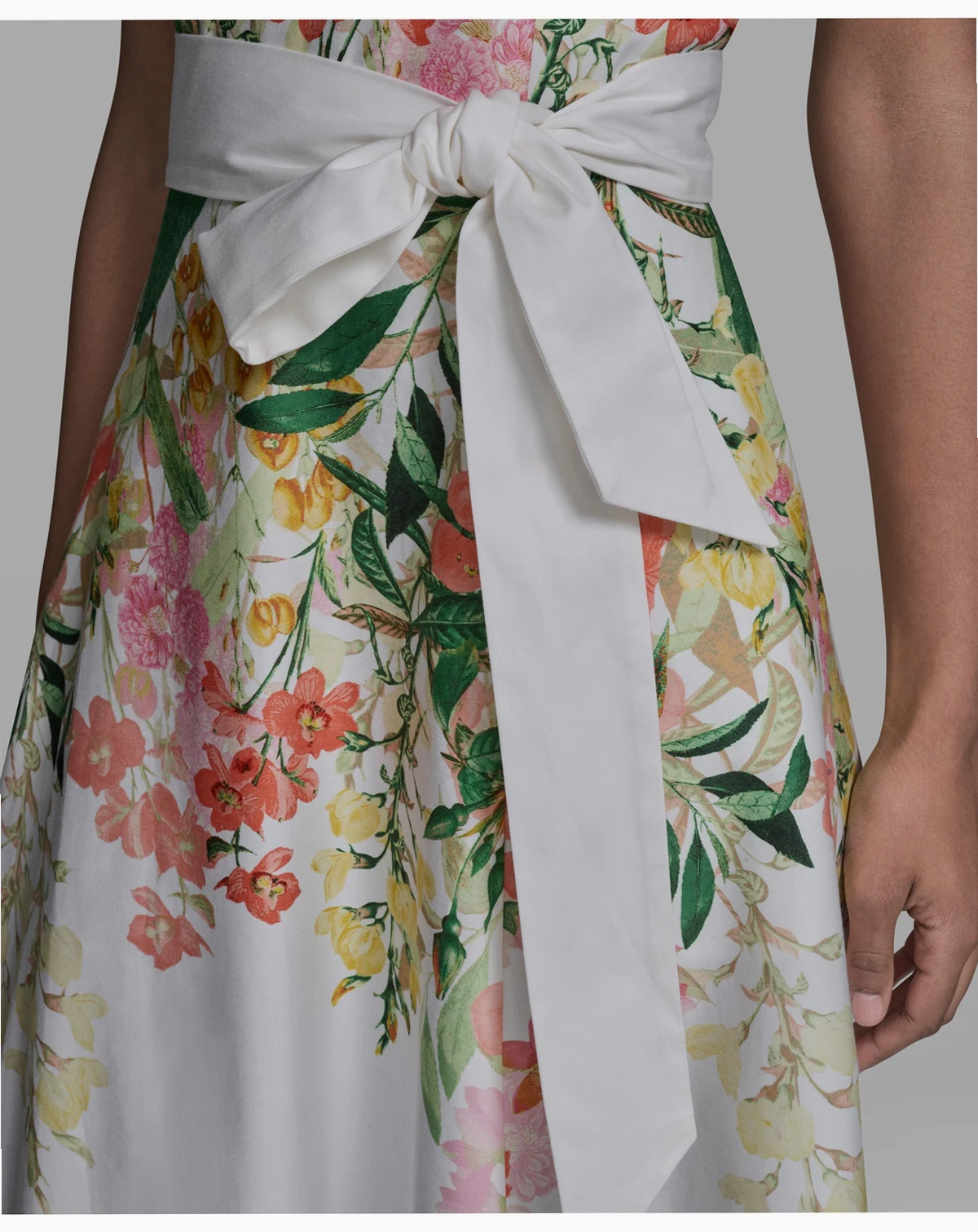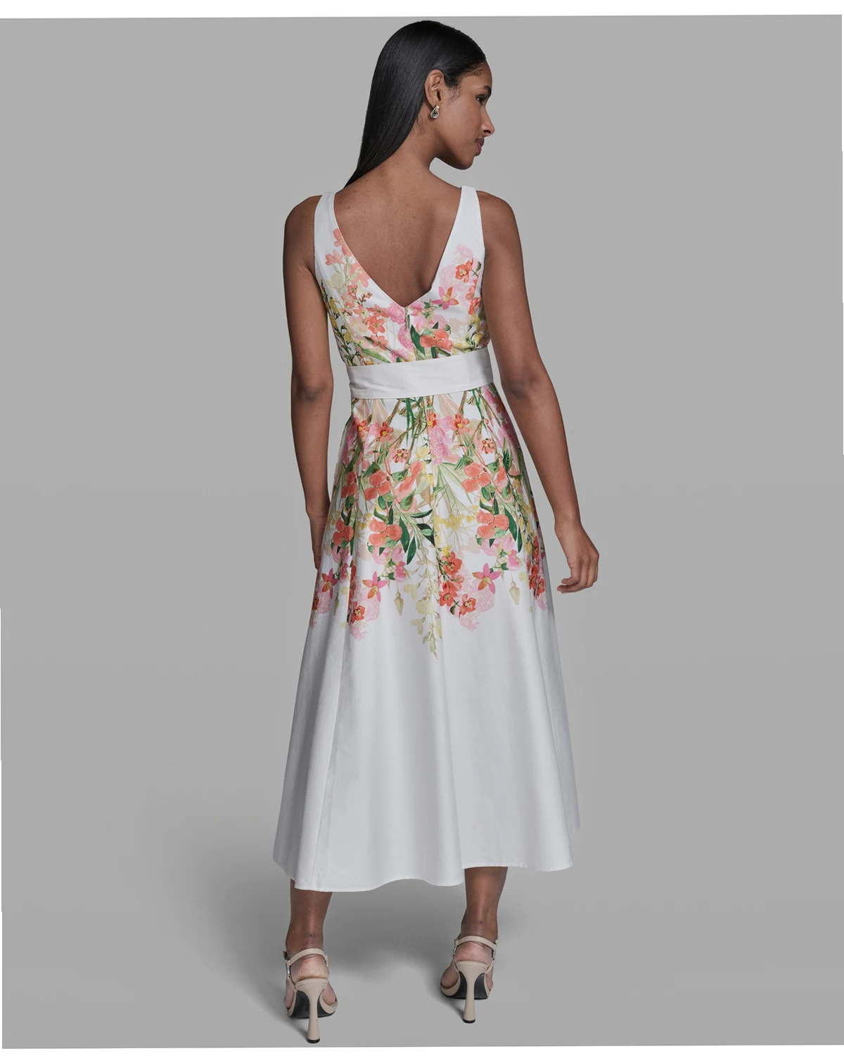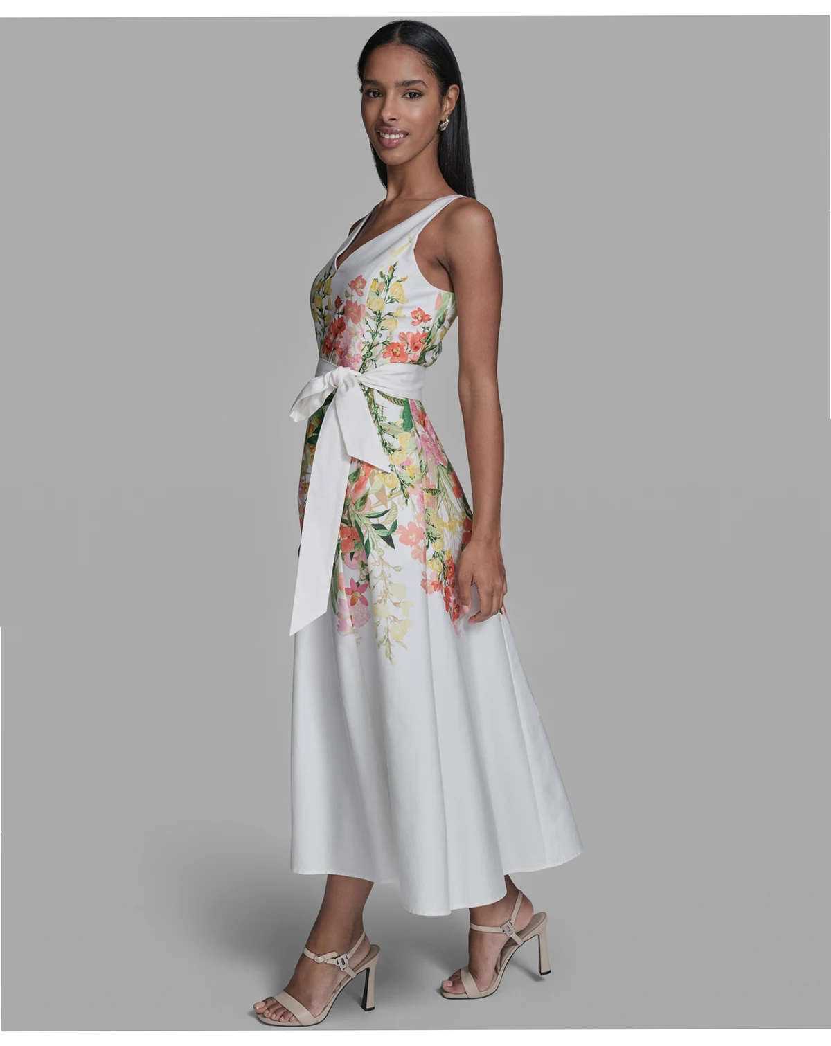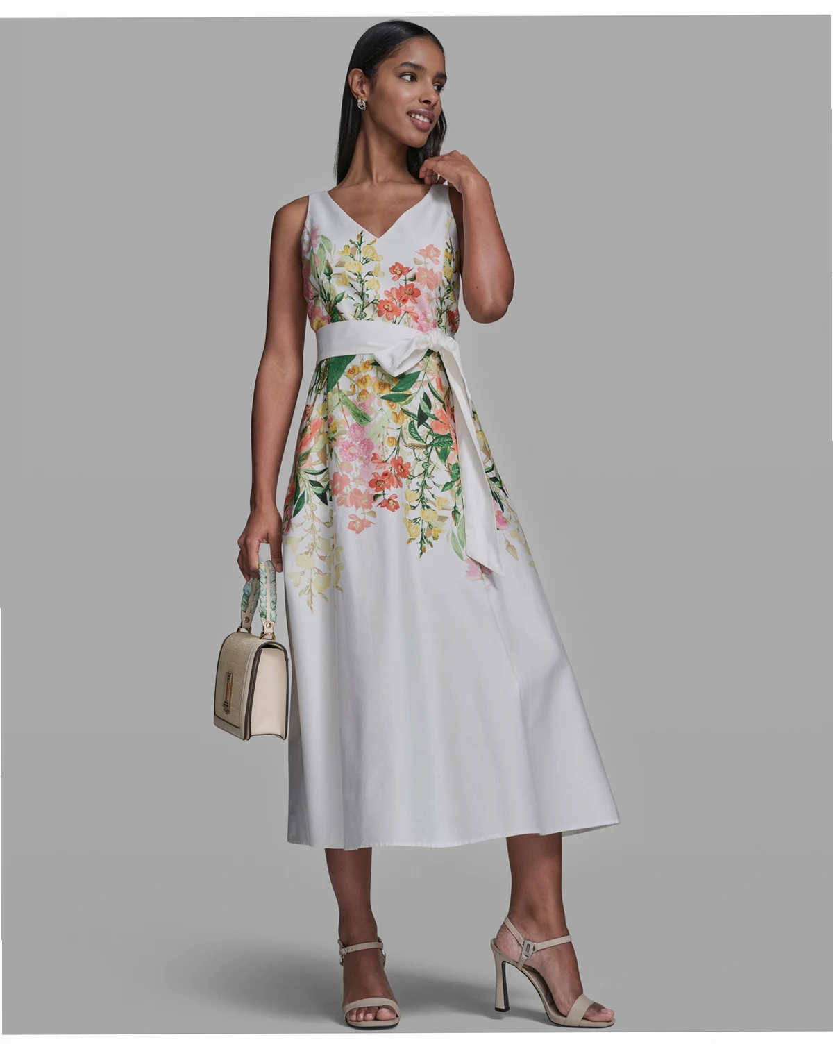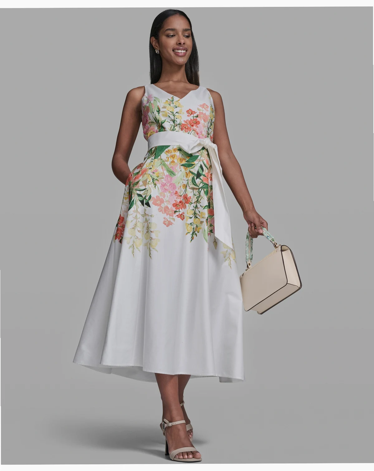 Modern polish meets effortless ease in this KARL LAGERFELD PARIS midi dress, crafted in printed cotton sateen with a self-tie sash. V-neckline and side pockets add functional sophistication.