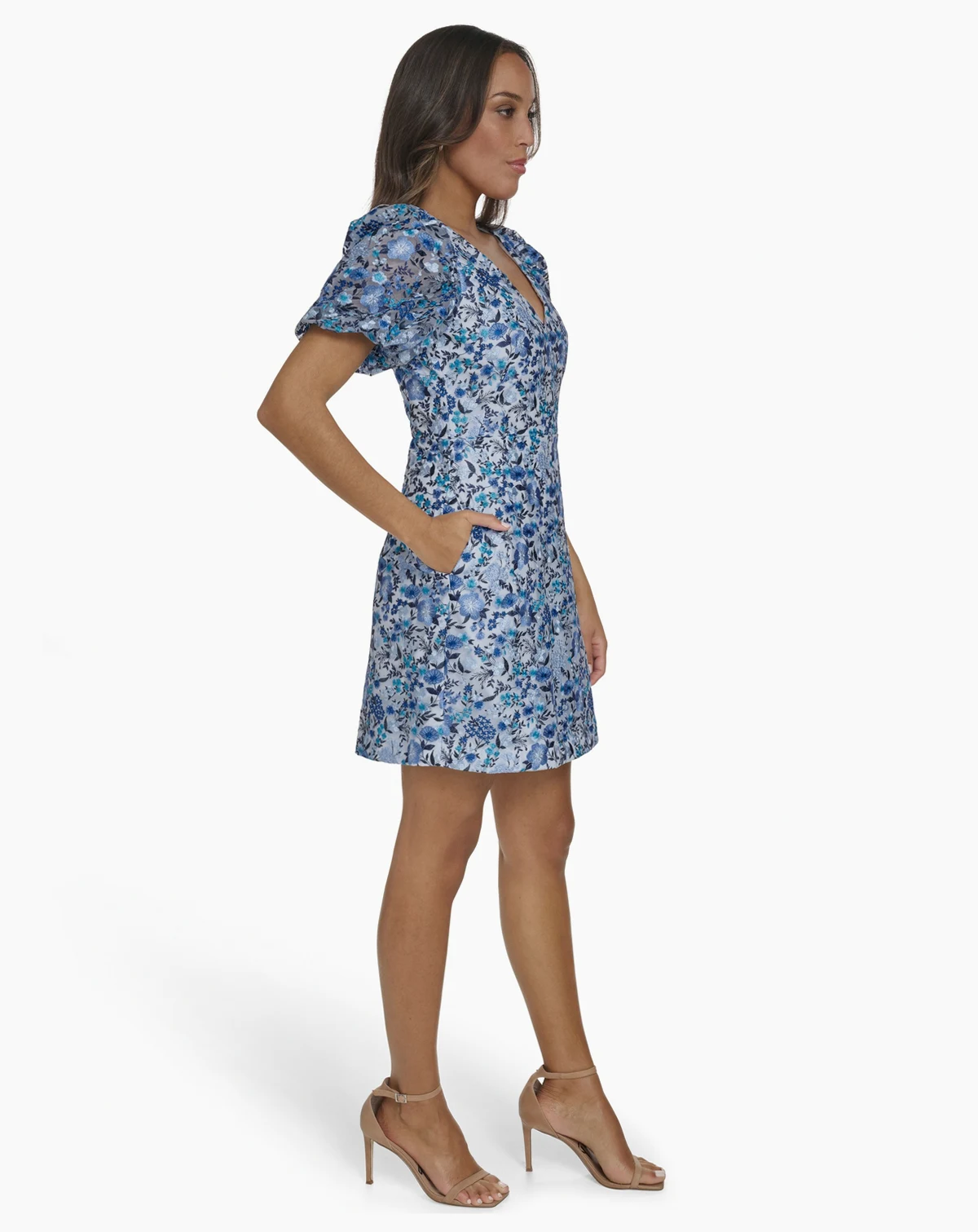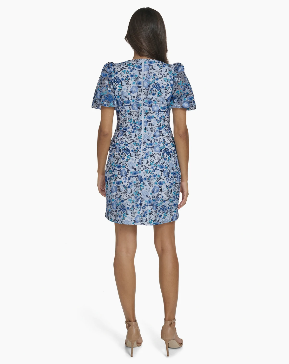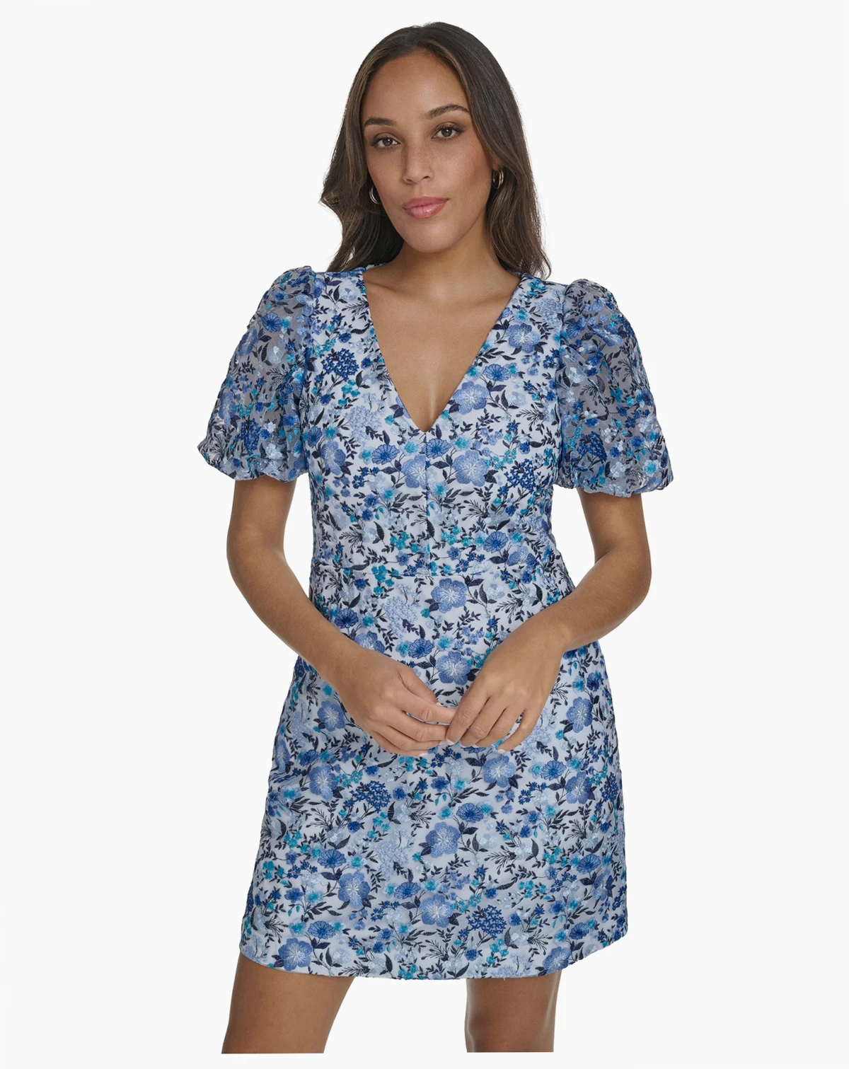 Channel romantic elegance in Eliza J petite dress crafted from embroidered mesh with a V-neckline and puff sleeves. The fit-and-flare silhouette creates a flattering, feminine shape.