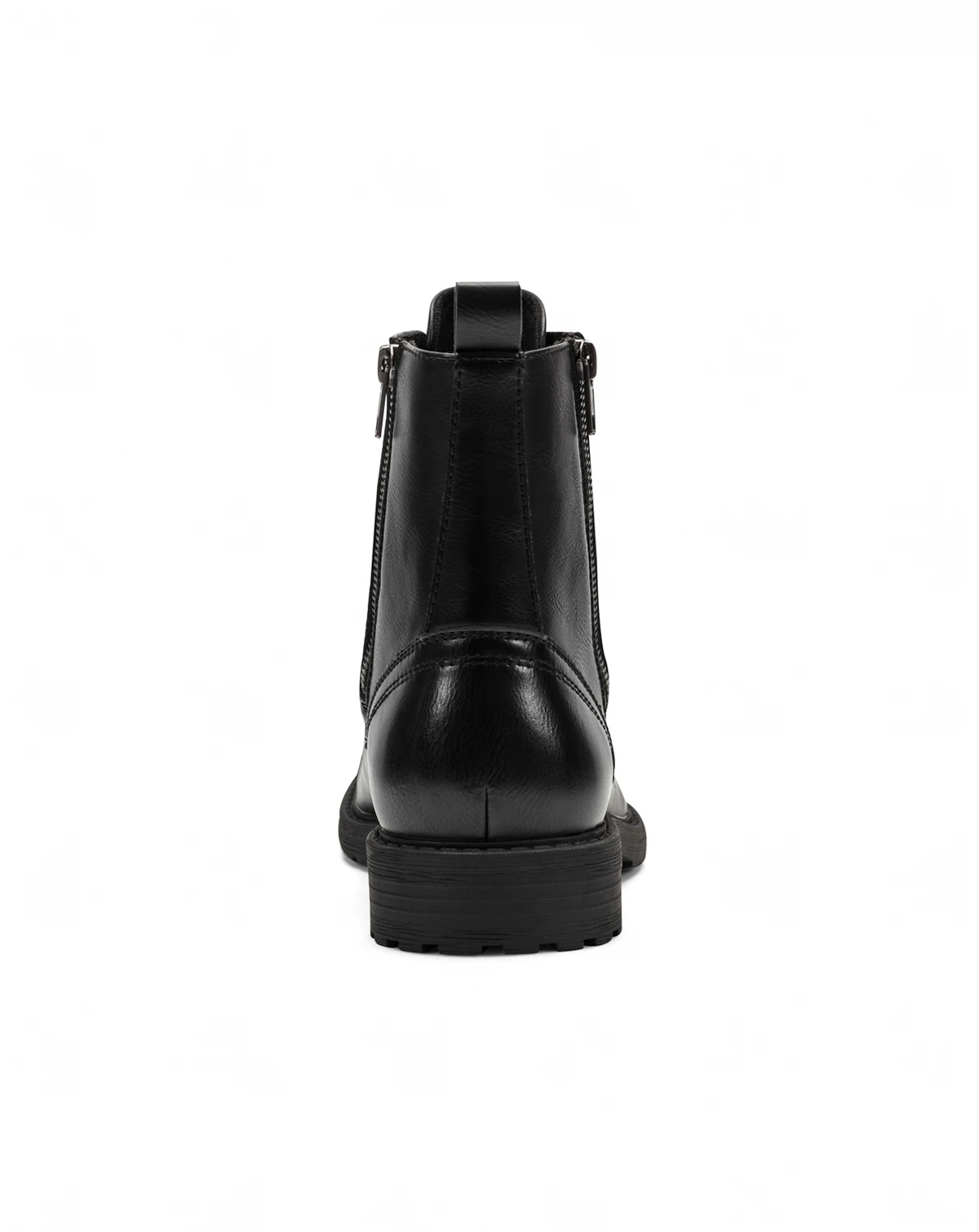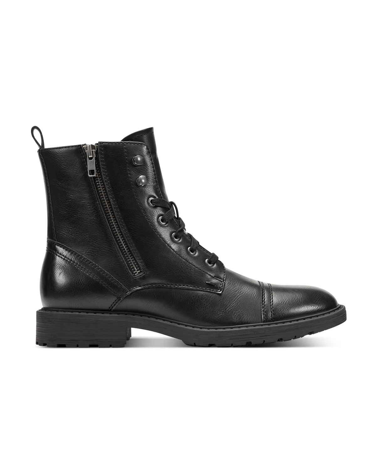 The Kenneth Cole Reaction Captain Combat boot with double zippers and adjustable laces cinches the get-it-on-and-get-going versatility of a boot styled with a cap toe and a lugged sole that reliably grounds every step.