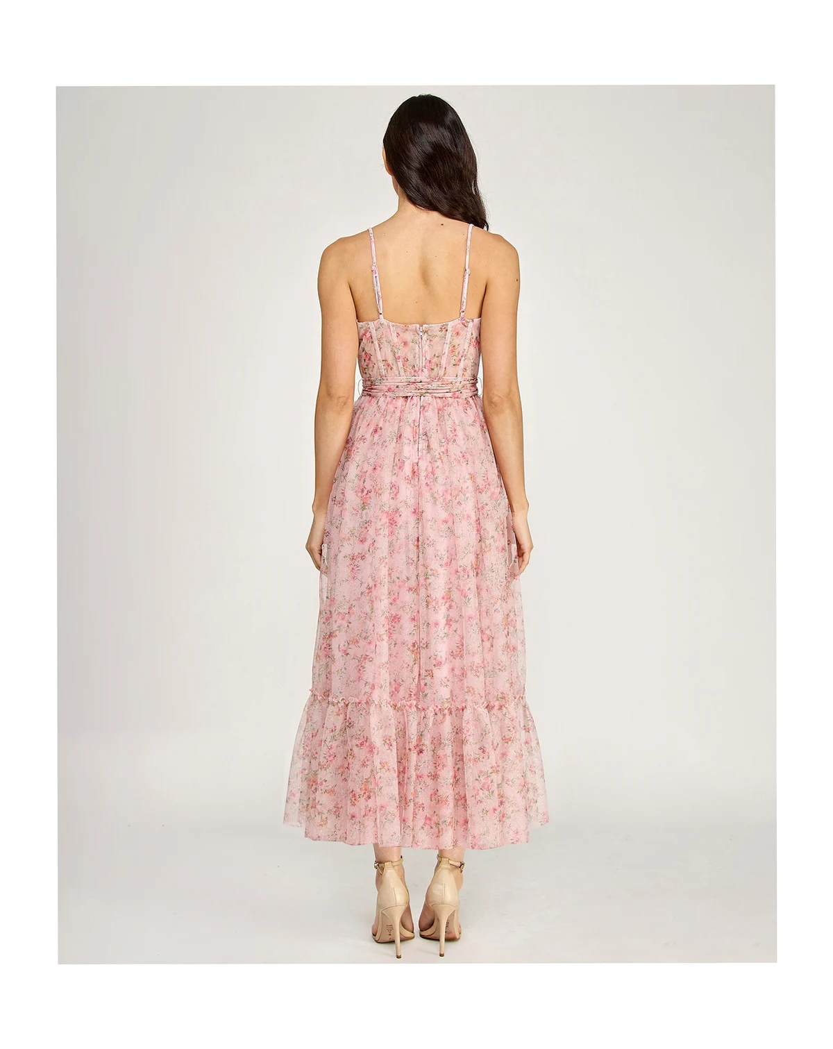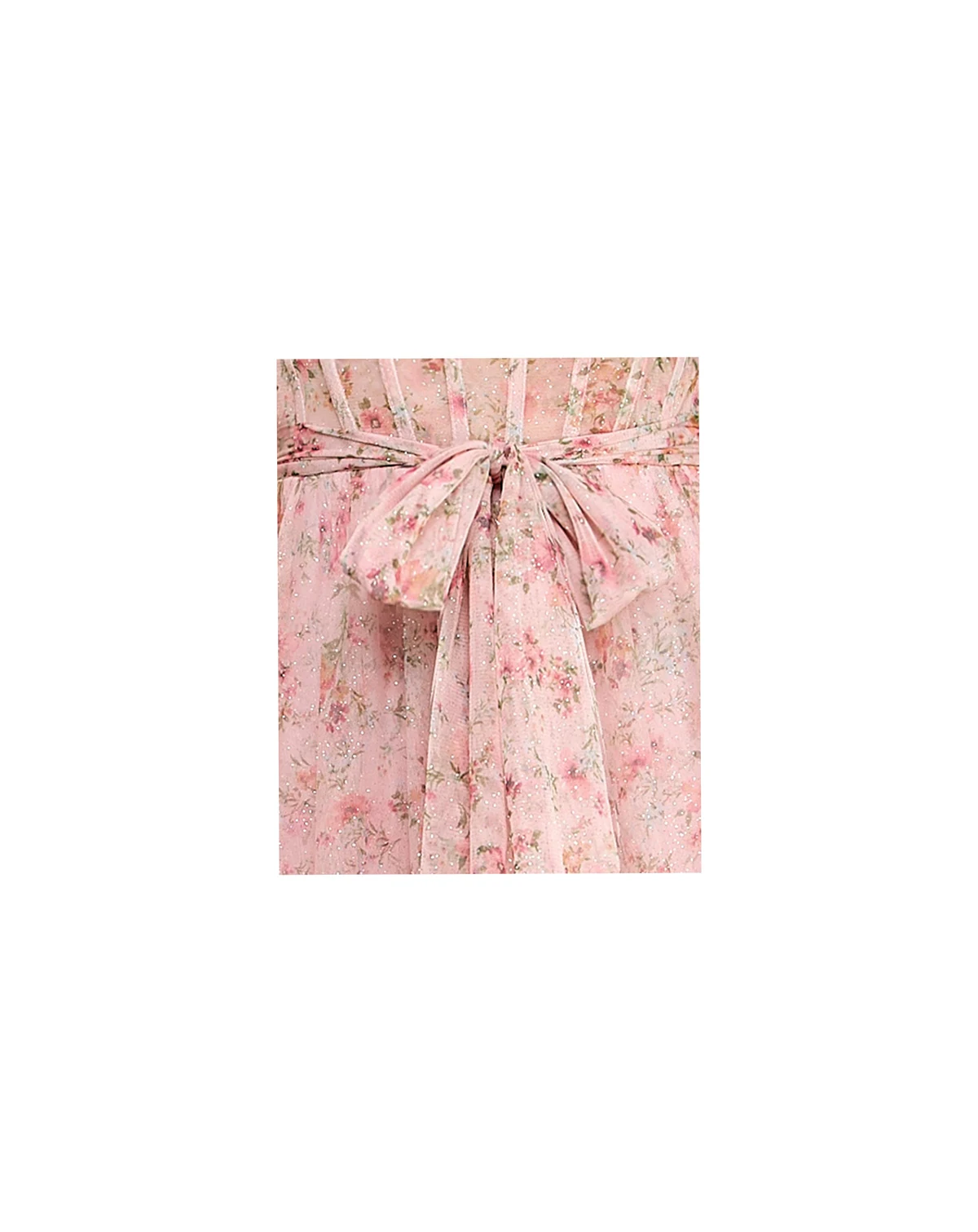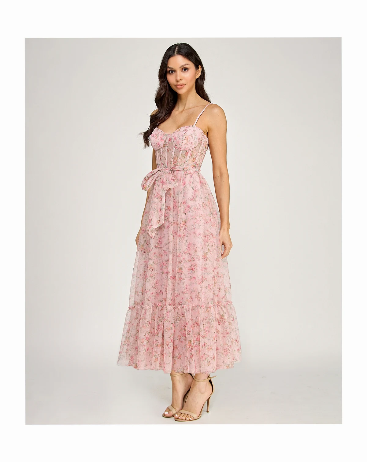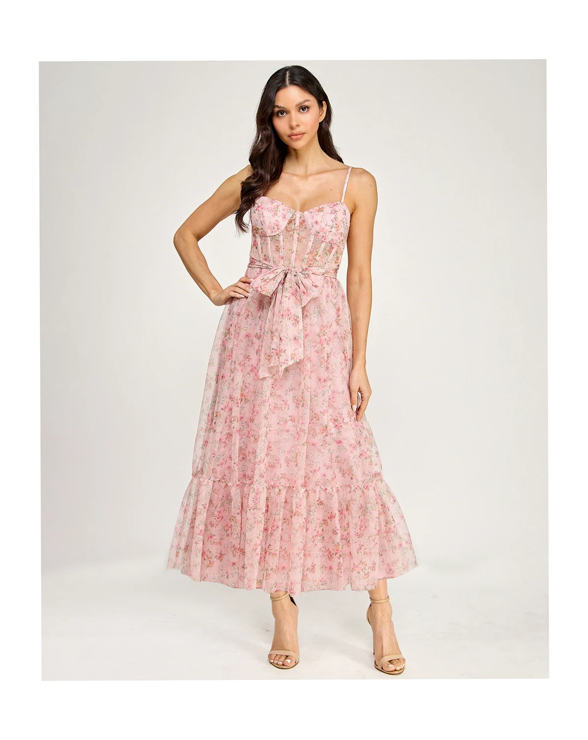 Evening elegance unfolds with this SENI & CADE floral glitter midi dress featuring a sweetheart neckline. Bustier shaping and a ruffle hem enhance structure and motion, while the sash belt provides balanced support.