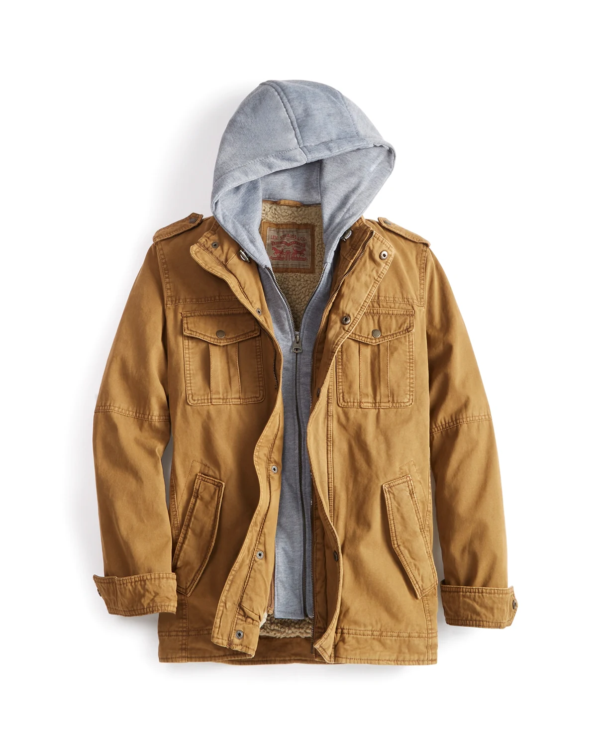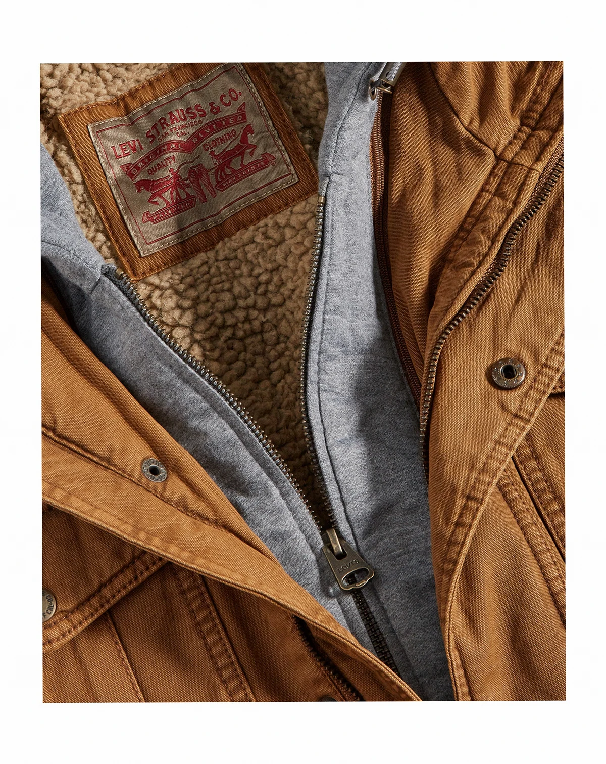 Special details like the drawstring hood and epaulette details at the shoulders give this Levi's® trucker jacket a distinctive edge.