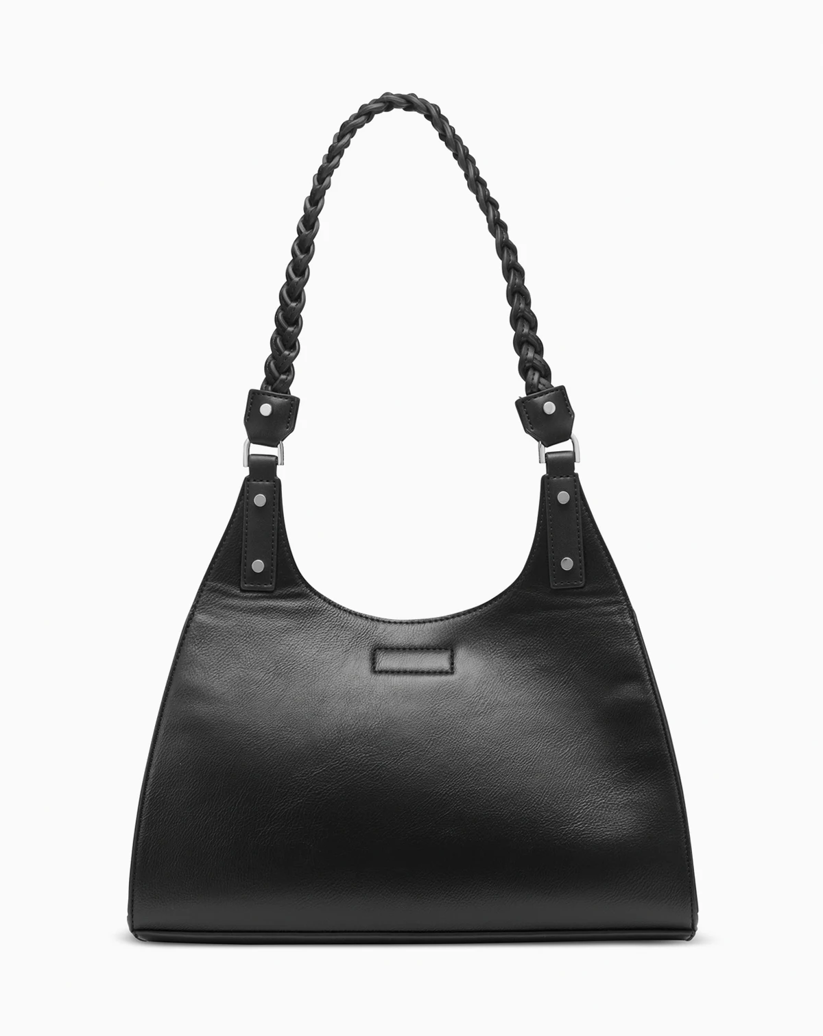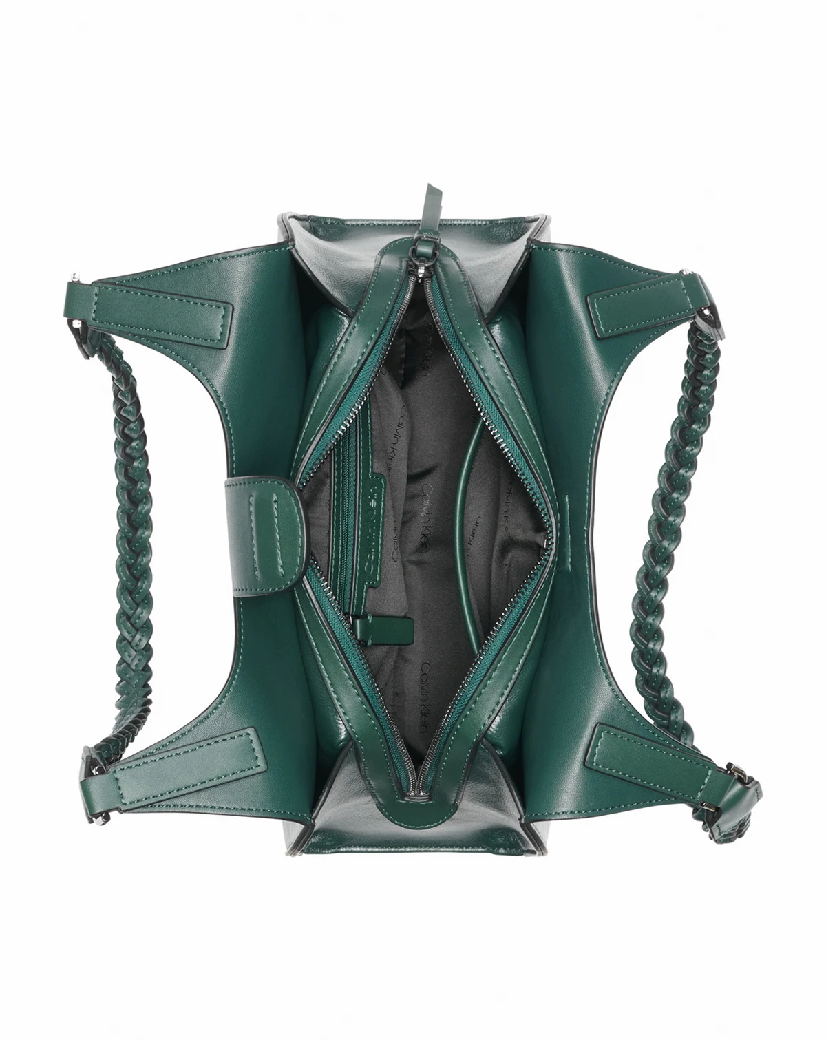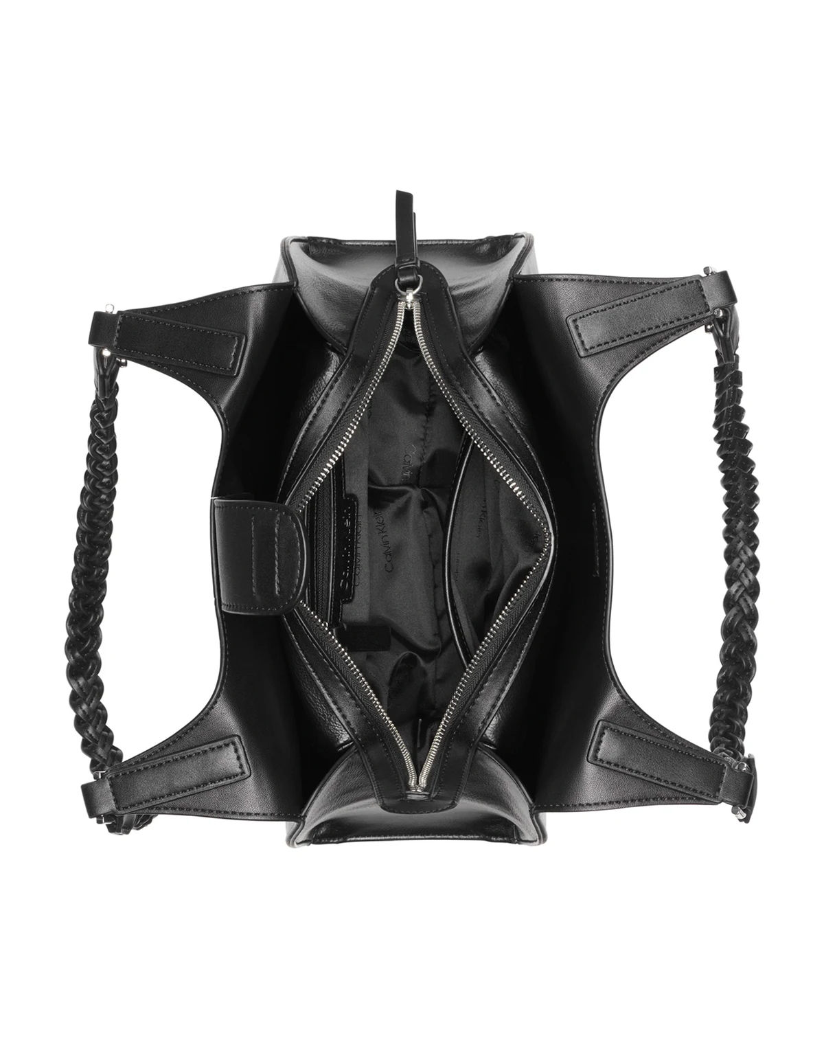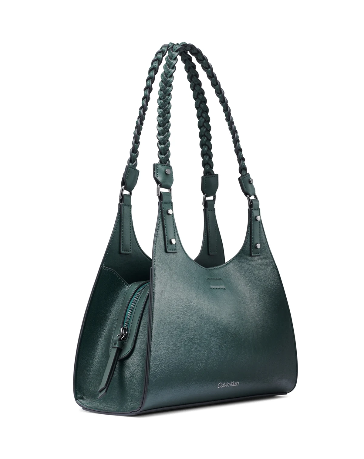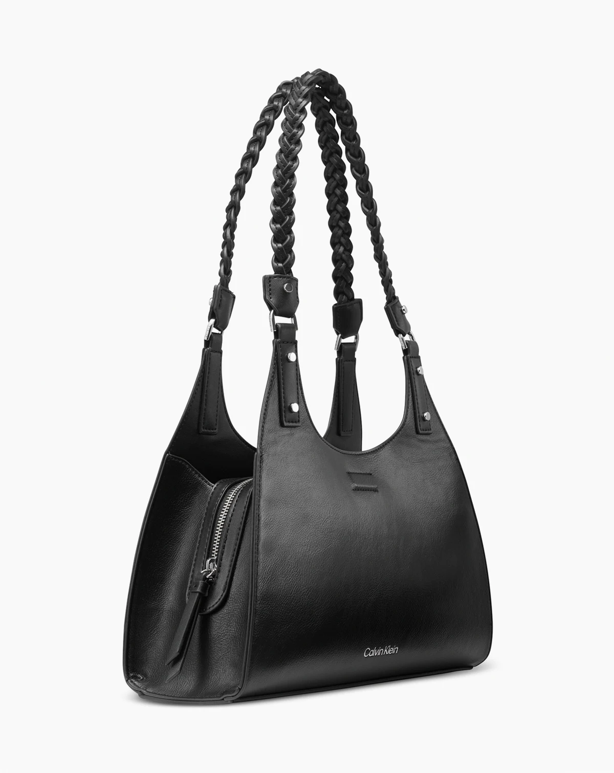 Available in a variety of colors and accented with braided straps and a logo medallion, this shoulder bag by Calvin Klein is perfectly sized with a variety of pockets a convenient zip closure.
