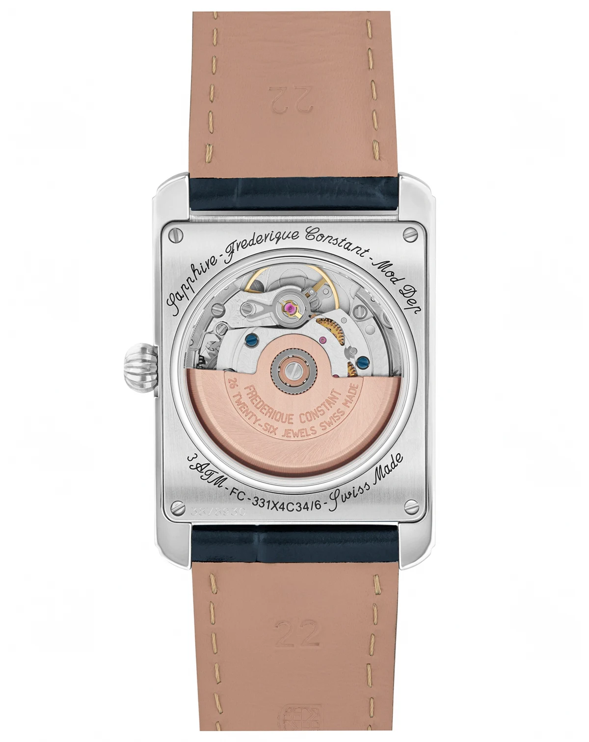 The Classics Carrée Moonphase Automatic features a 42.3x30mm steel case, navy sunray dial with guilloché, silver-tone hands and indexes, and iconic moonphase. Powered by the FC-333 with 38-hour reserve, it comes on a navy calf leather strap.