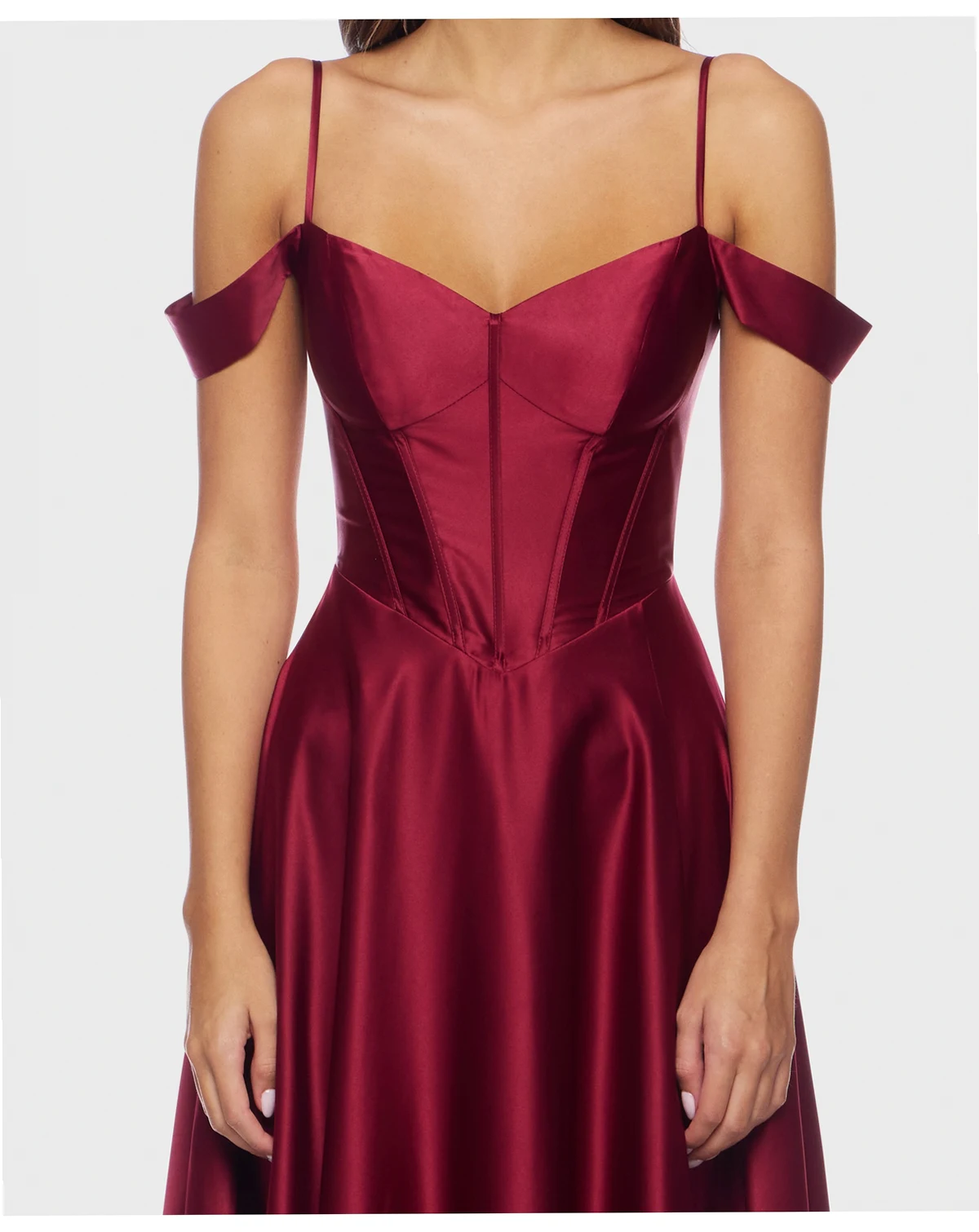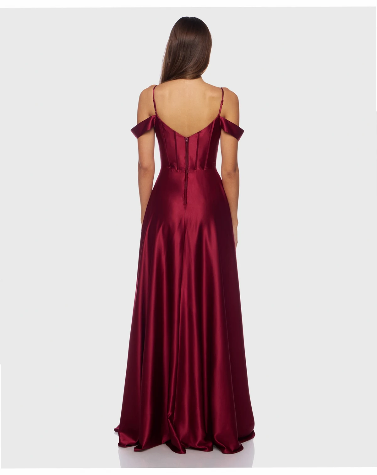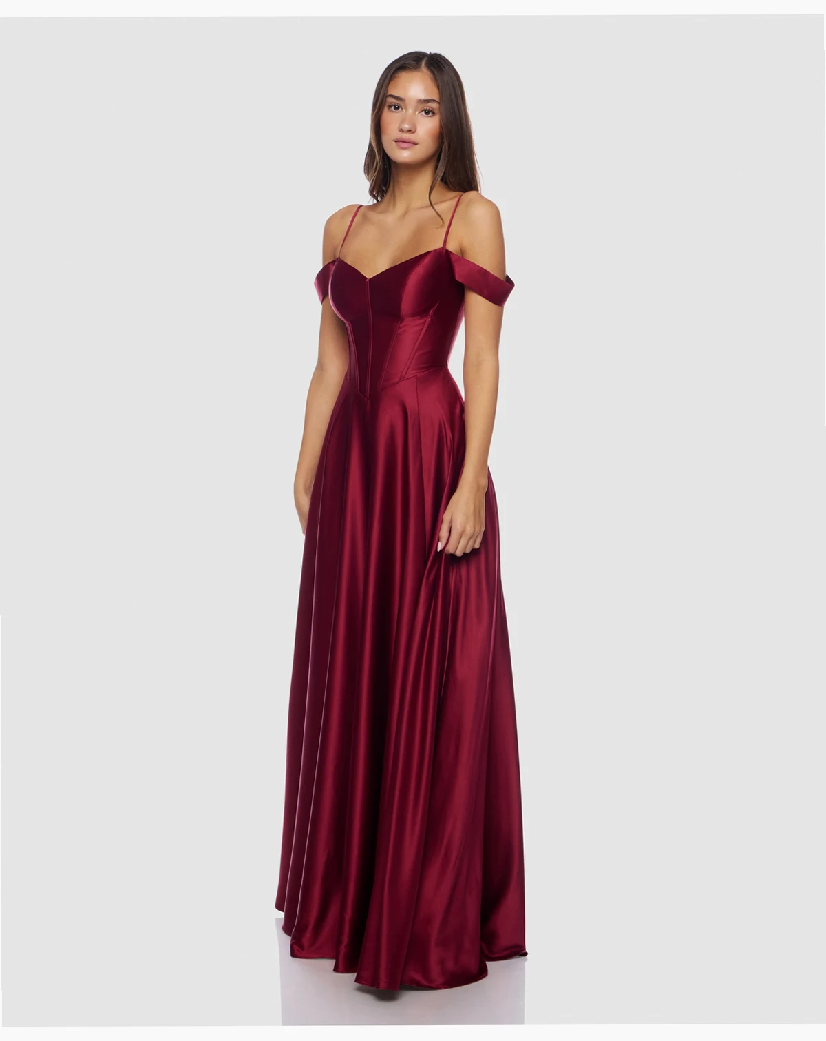 Draping in a soft, dull charmeuse, this B Darlin dress combines an off-the-shoulder neckline with a sweetheart bodice. The long, flowing skirt creates a romantic and ethereal effect.