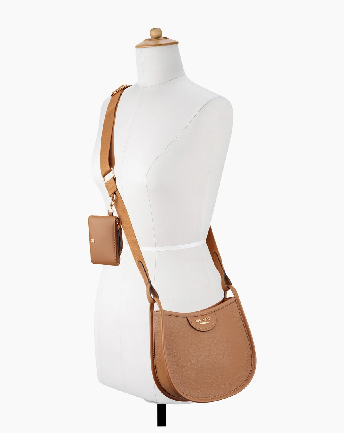 Nine West designer Calliope feed swing crossbody bag. Perfect everyday bag and travel companion to fit your essentials and more. Strap anchor details with card case included. Internal organization and updated modern hardware.
