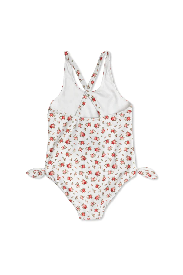 Infused with the playful sophistication of Dolce & Gabbana Kids , this classic one-piece swimsuit enchants with a delicately scattered red and pink rose motif set against a refined white background. Designed for girls ages 4 to 14, it features a modest front and a daring open back with cross-over straps, ensuring comfort and stability through every splash and swim.