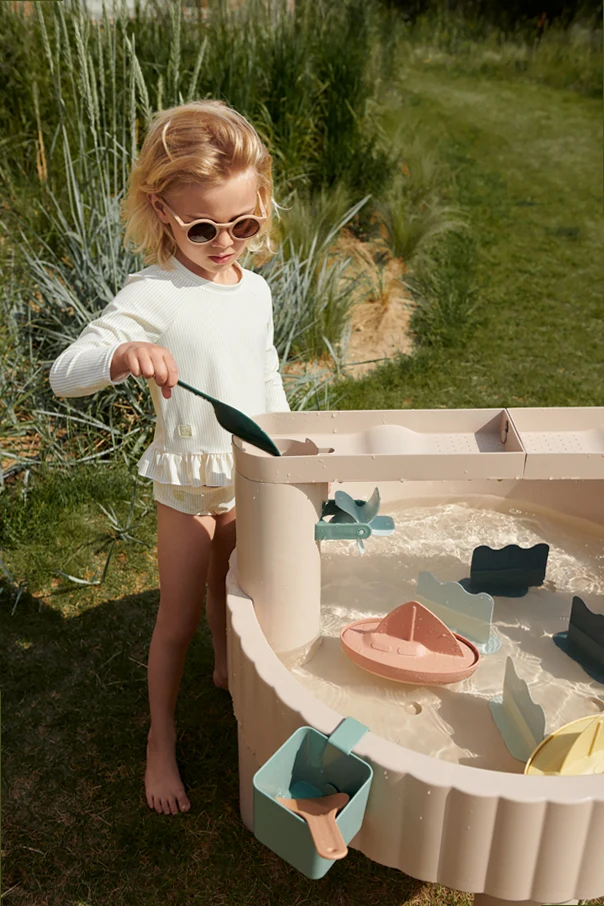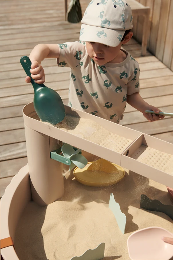 Introducing the exquisite Liewood Sepp Sandy Multi Mix Play Table , a quintessential addition to any child's playtime repertoire. This elegantly designed table, with its round shape and elevated rim, ensures that sand and toys stay securely in place. Crafted from high-quality, partially recycled plastic in a sophisticated beige hue, it exudes a refined yet neutral aesthetic.