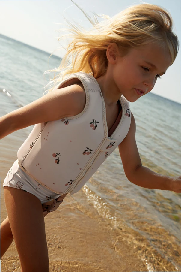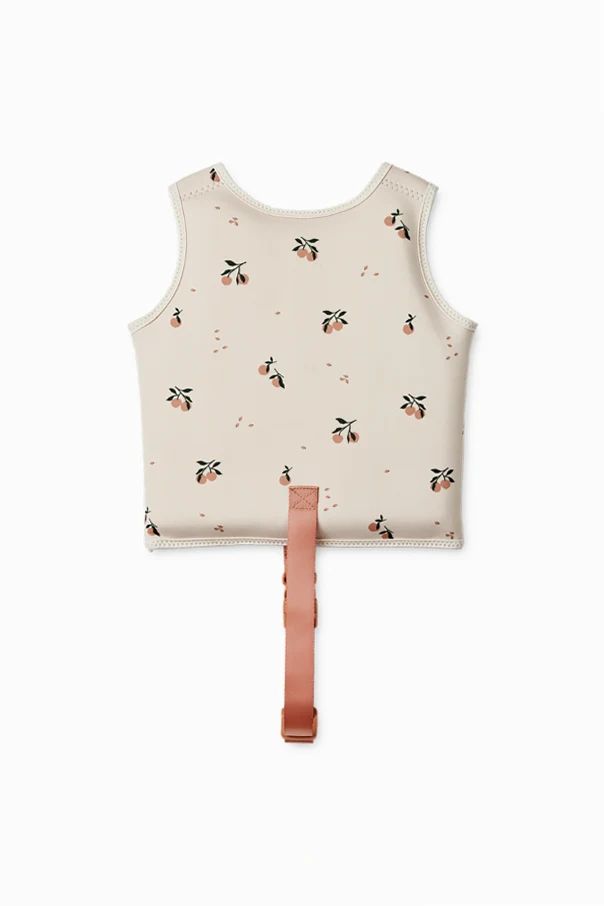Introducing the Dove Swim Vest from the exclusive collection of renowned designer Liewood . This exquisite piece is crafted from a delicate blend of neoprene and polyester, offering a soft, smooth texture that is both lightweight and water-resistant. The vest features a dominant cream hue adorned with subtle graphical motifs, reminiscent of fruits or flowers.
