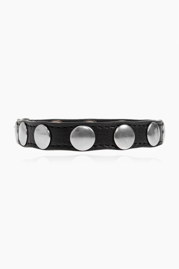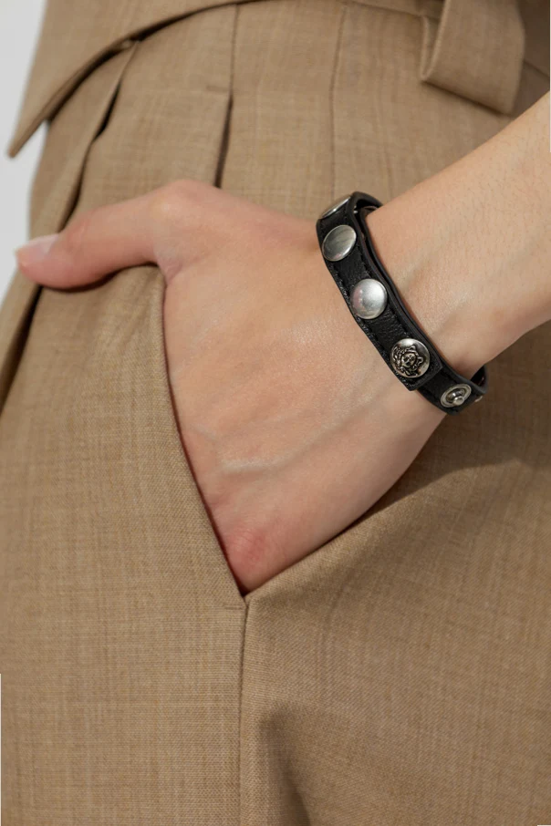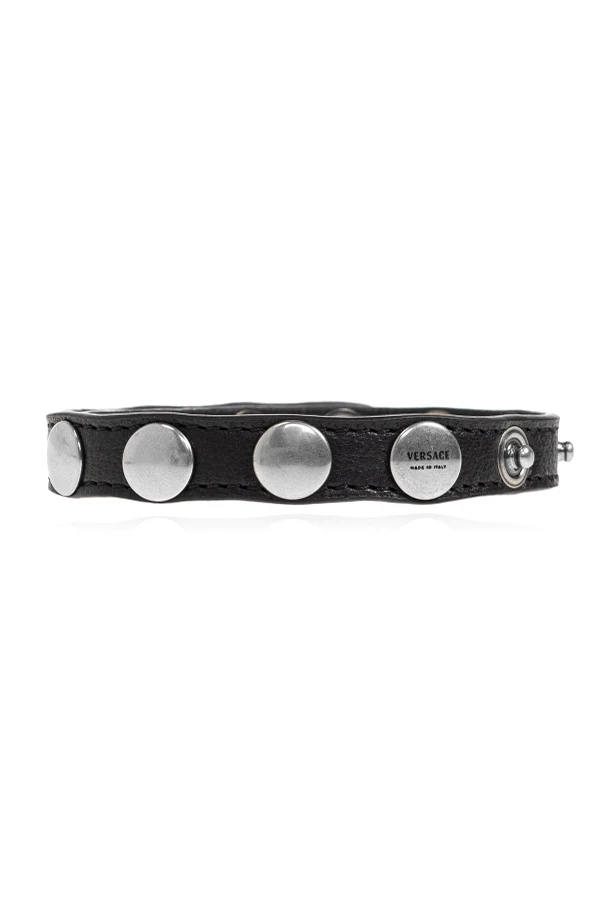 The bracelet boasts meticulously placed round metal studs in a sophisticated silver tone, artfully contrasting with the deep black leather. Distinctive touches include subtly embossed Medusa heads—Versace's signature motif—and branded stud caps, each detail orchestrated in unison for a refined, coherent aesthetic.