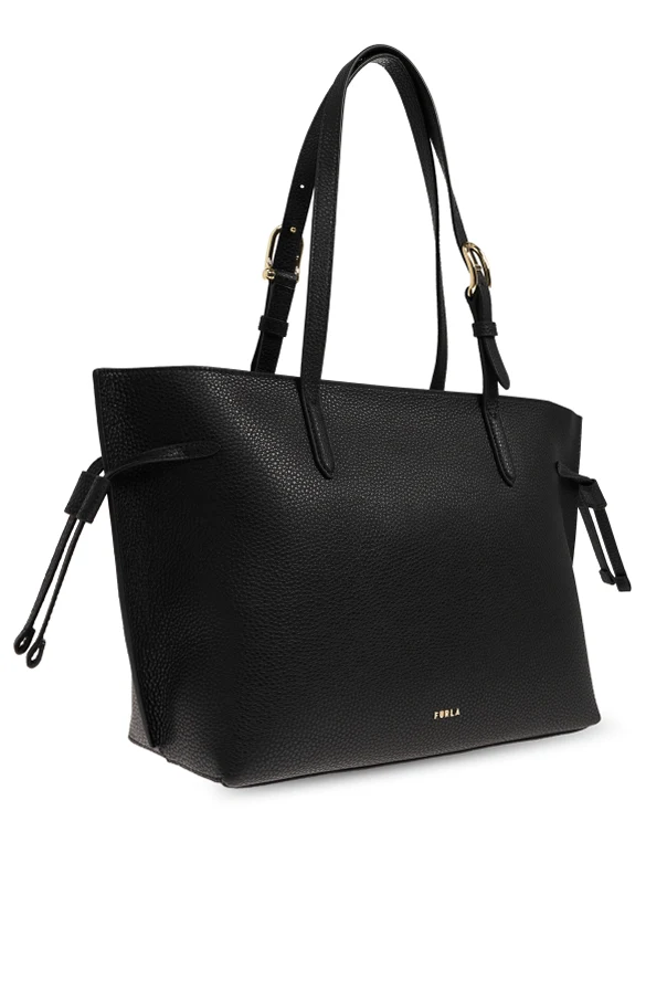 Thoughtfully designed, the dual elongated handles—adjustable with polished gold buckles—allow seamless transition between hand and shoulder carry. Decorative side straps not only enhance the bag’s aesthetic but also provide subtle functionality by gently cinching the sides when desired. The understated gold Furla logo at the lower front lends a touch of minimalist sophistication, distinguishing this piece as a true icon of modern luxury.