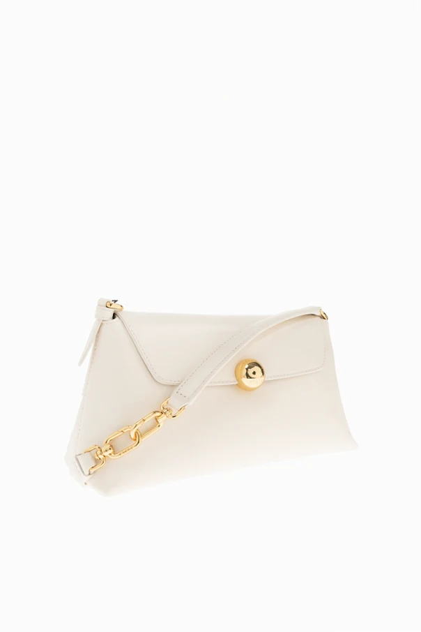 The distinctive flap closure is secured by a prominent, spherical gold button adorned with a discreet, elegantly inscribed logo, serving as the design's signature flourish. A short, structured handle, enhanced with a decorative gold connector, allows for graceful hand-carrying, elevating the bag's exclusivity. The dark gray-lined interior is thoughtfully appointed with a secure zip pocket, balancing aesthetic purity with everyday practicality.