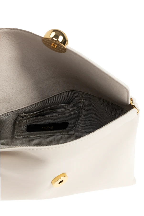 The Sfera Soft Mini by Furla epitomizes refined minimalism, seamlessly blending subtle sophistication with timeless allure. Crafted from exquisitely smooth natural leather, this cream-hued handbag features a soft rectangular silhouette with gently rounded lines, bestowing an air of delicate elegance.