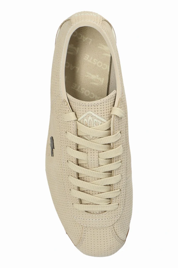 Distinct detailing includes the signature metal crocodile emblem on the side, an iconic symbol of Lacoste’s legacy, and a designer-branded tongue with subtle graphic elements. Smooth, color-coordinated laces enhance the shoe’s monochromatic sophistication, while the outsole blends beige and caramel rubber hues with a pronounced, serrated tread for superior grip and modern flair.