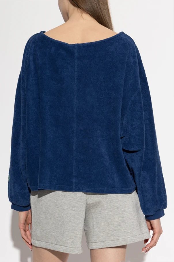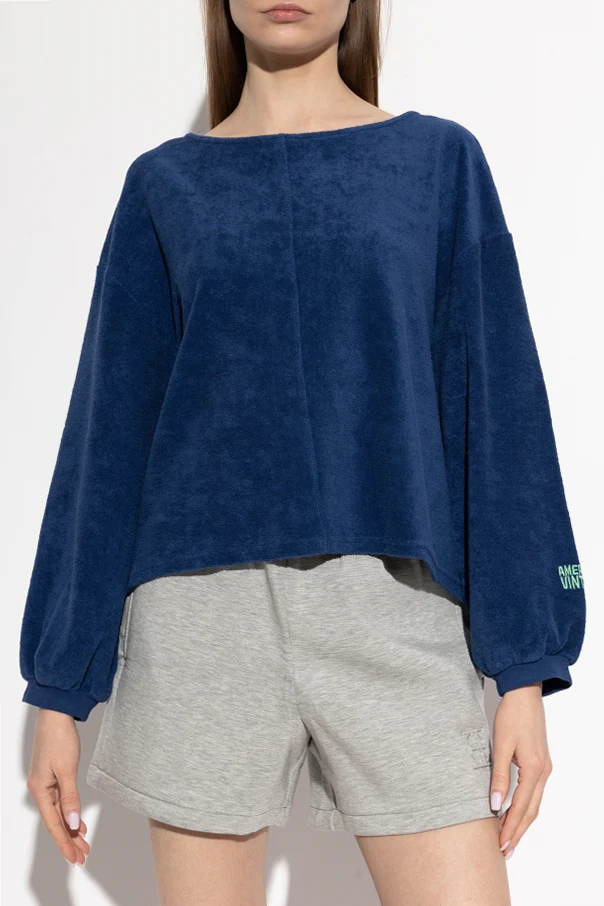 Embrace effortless sophistication with this oversized navy blue sweatshirt from American Vintage . Crafted from a plush, cotton-based fabric with a subtly velvety texture, this piece envelops you in unparalleled softness while exuding modern elegance. The relaxed silhouette features generously wide sleeves and a dropped shoulder line, enhanced by a straight, slightly cropped hem for a contemporary, casual allure.