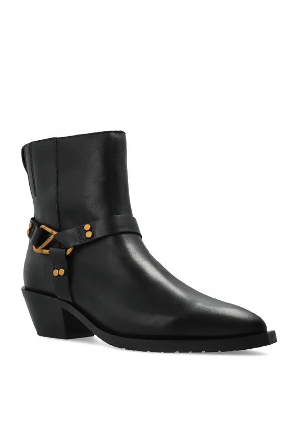 The elongated, subtly pointed toe and mid-height, gently tapered heel embody both elegance and stability—perfect for elevating any look. A striking leather strap with a gold-tone buckle and decorative gold studs embellishes the ankle, while a refined gold side zipper ensures graceful ease of wear.