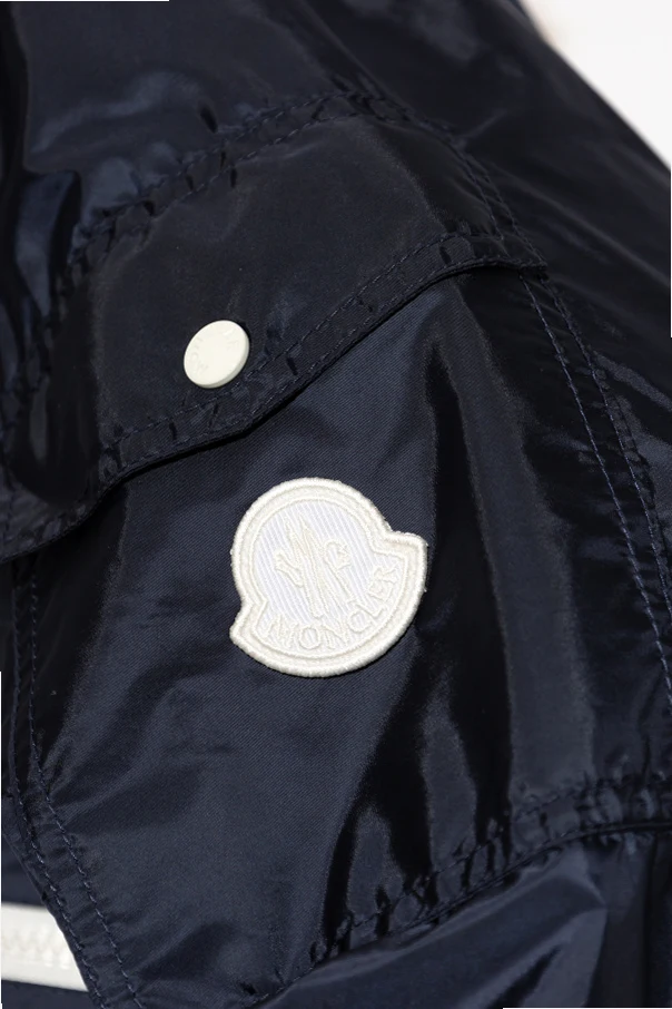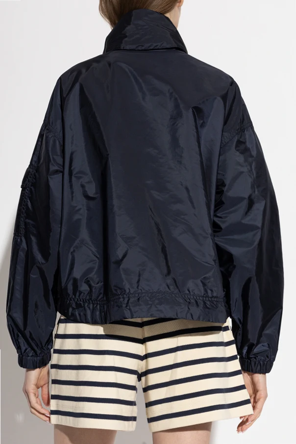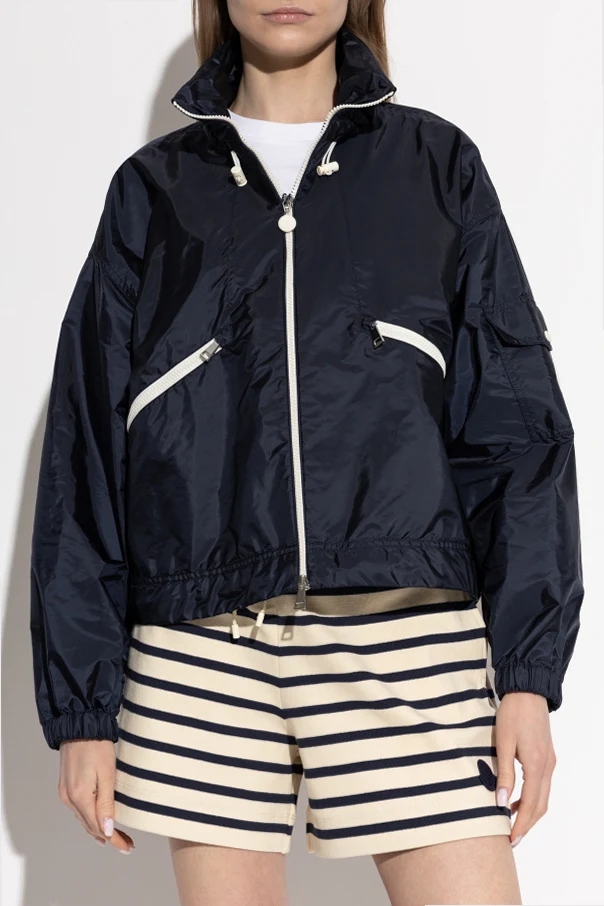 Striking details abound, from the high stand collar adorned with decorative drawstrings, to the full-length zipper and slanted zip pockets in an elegant light ivory accent that contrasts exquisitely against the rich navy. A signature snap-pocket embellishes the left sleeve, offering both utility and unmistakable character. Moncler’s legacy of combining sporty allure with elevated design is unmistakable in this statement jacket.