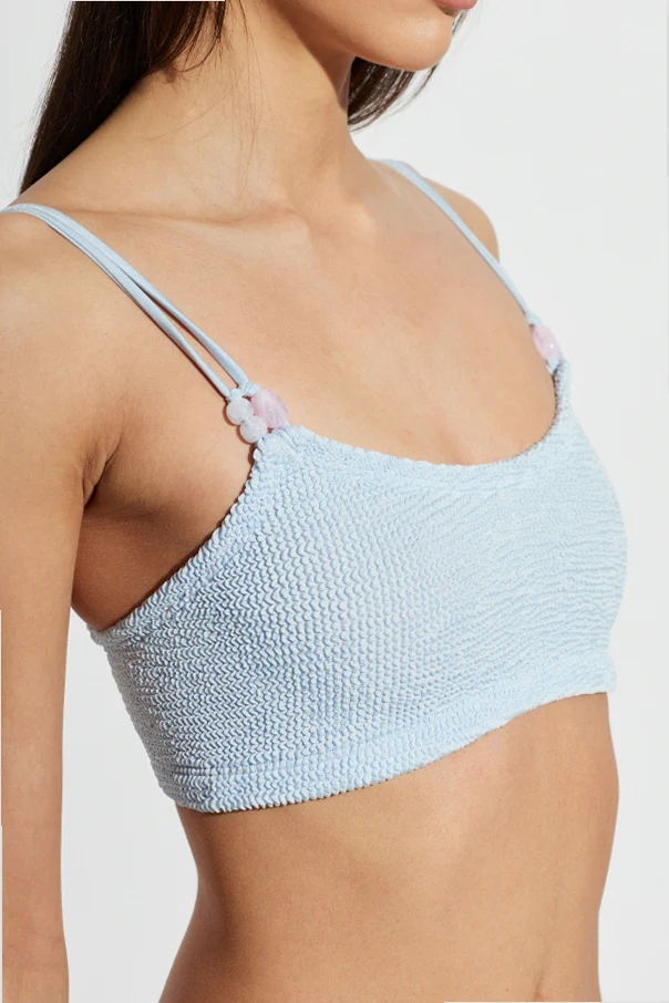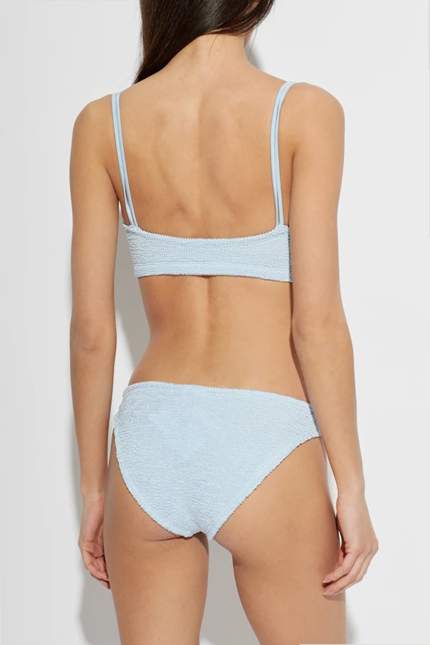 The 'Cassie' Two-Piece Swimsuit by Hunza G epitomizes sophisticated beachside style. This timeless bikini features a wide, rectangular top with a refined straight neckline, complemented by a classically cut bottom, both crafted from luxuriously textured terry fabric. The intrinsic, ruched material lends a subtle elegance and a distinguished tactile dimension to the ensemble.