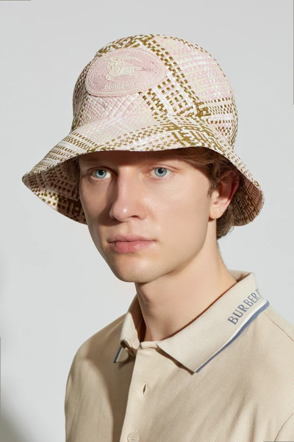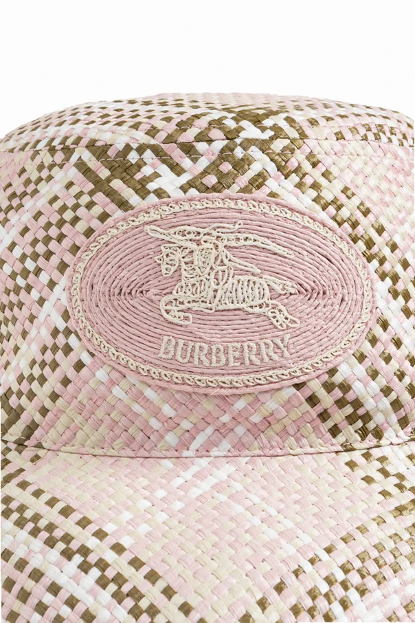Meticulously woven from straw-inspired viscose, the hat offers exceptional lightness and breathability, making it ideal for warm-weather escapades. The gently sloped brim and rounded crown evoke timeless elegance, while the meticulously stitched light pink oval patch with Burberry's embroidered logo and Equestrian Knight Design lends unmistakable prestige.