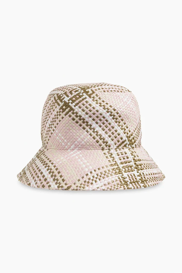 Elevate your summer attire with this classic bucket hat from Burberry, expertly crafted for discerning tastes. Cloaked in a delicate pink hue with intricate light pink, olive, and white plaid reminiscent of Burberry’s iconic pattern, this piece exudes understated sophistication.