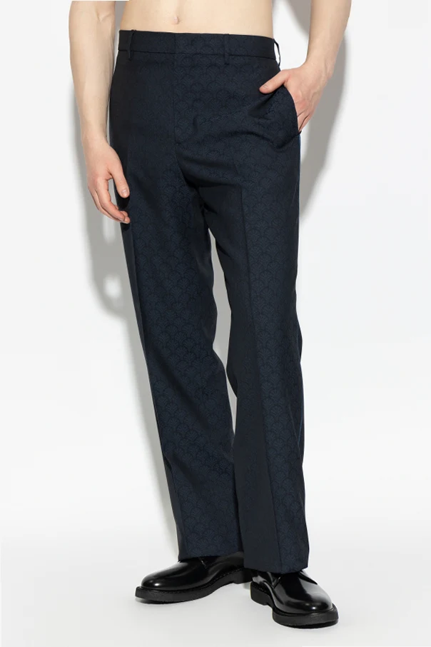 A subtle, all-over geometric motif , reminiscent of art deco or delicate fans, distinguishes these pants and underscores their exclusive character. Discreet side pockets in front, two buttoned flap pockets at the back, and refined belt loops contribute both functionality and aesthetic harmony. The absence of external logos attests to the garment’s discreet sophistication.