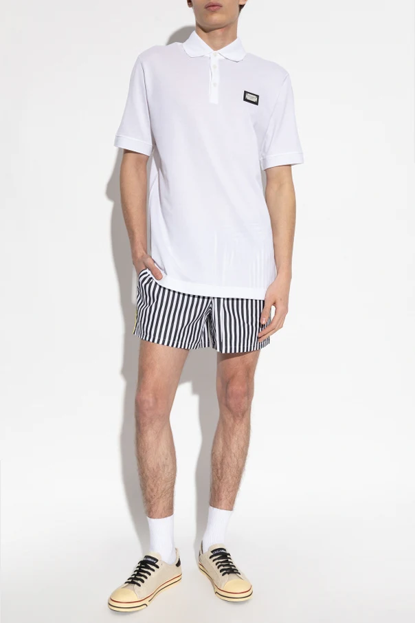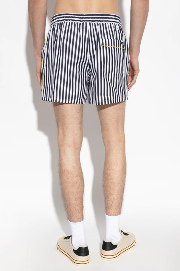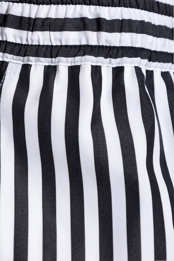 The streamlined silhouette features a relaxed, mid-thigh cut for a flattering yet effortless aesthetic. Striking black and white vertical stripes extend throughout, infusing the piece with a modern, minimalist allure. A discreet elastic waistband with an external drawstring promises individualized fit and lasting comfort, while the back pocket, adorned with the signature striped motif, subtly elevates the design’s exclusive charm.