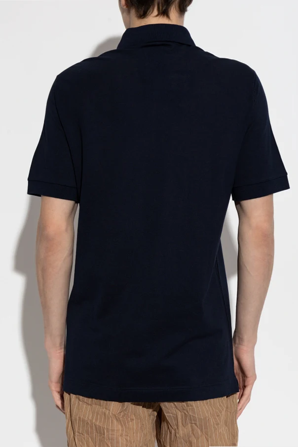 Distinguishing this piece is a striking rectangular designer logo appliqué on the left chest—affixed with four metal rivets—showcasing exquisite attention to detail. The sleeves feature subtle ribbed cuffs, while the back remains perfectly smooth, ensuring both comfort and a polished silhouette. The three-button collar placket lends a classic polo finish.