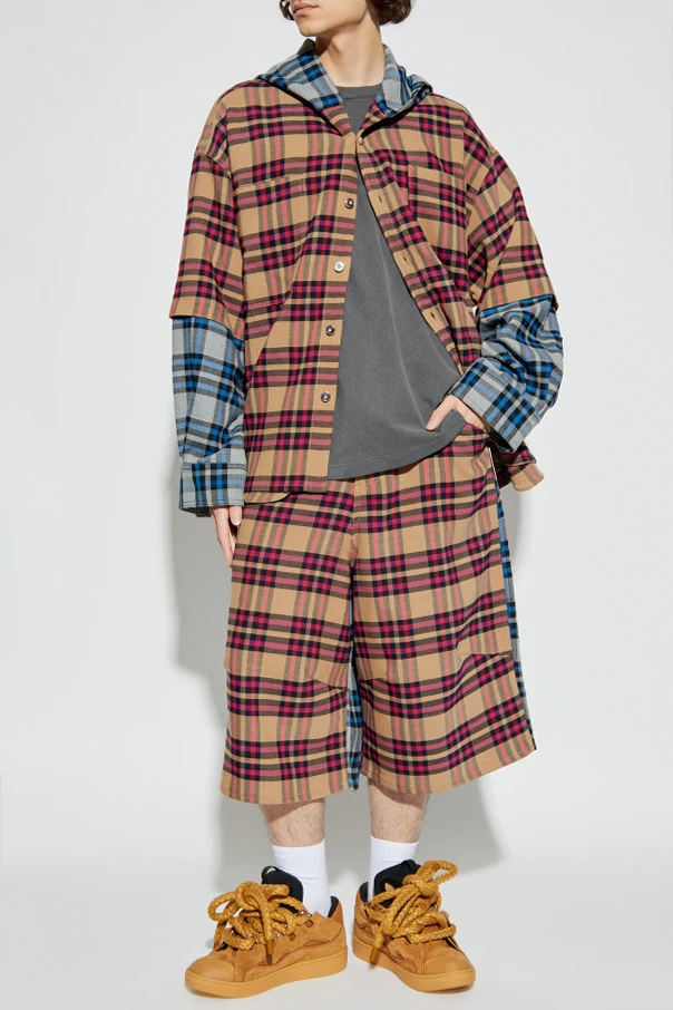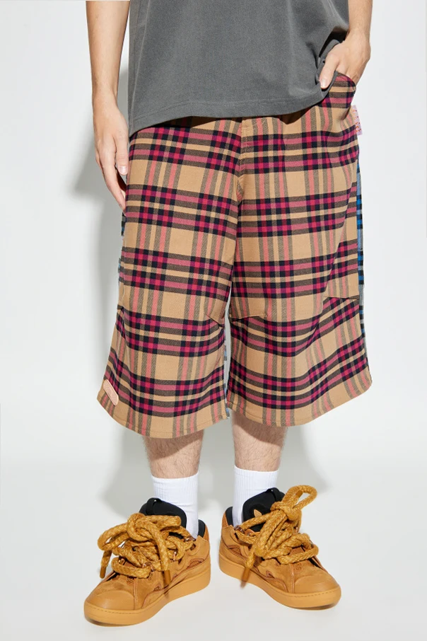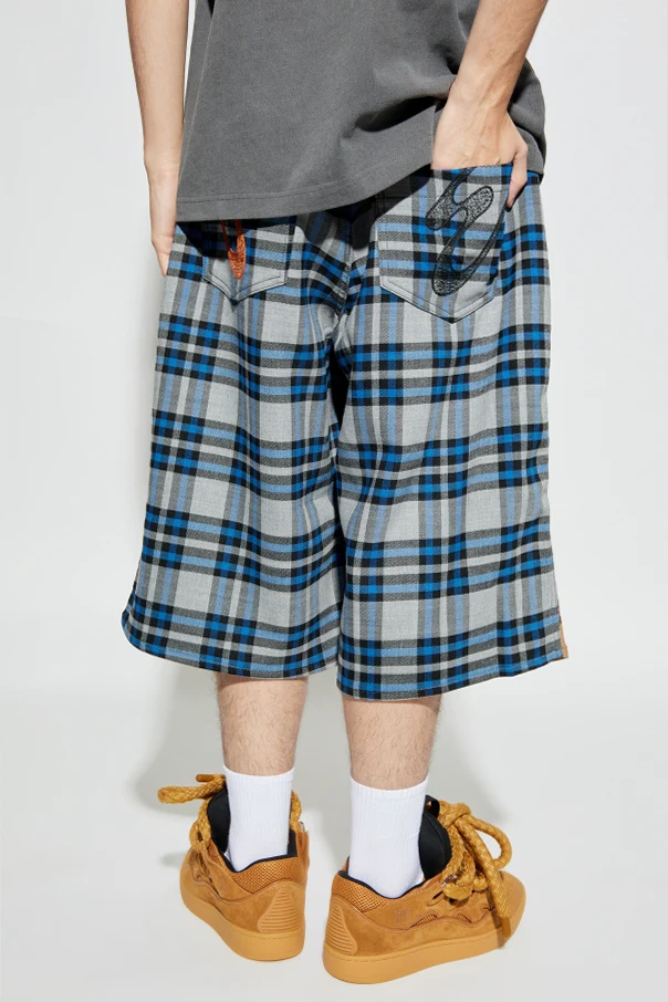 These designer turtleneck shorts embody contemporary sophistication with a bold, oversized silhouette distinguished by generous, wide legs and a distinctive below-the-knee length. The plaid motif captivates—beige with touches of red, navy, and black adorns the front, seamlessly contrasting the blue-gray-black checks that grace the back, evoking a refined juxtaposition emblematic of modern streetwear infused with high-fashion sensibility.
