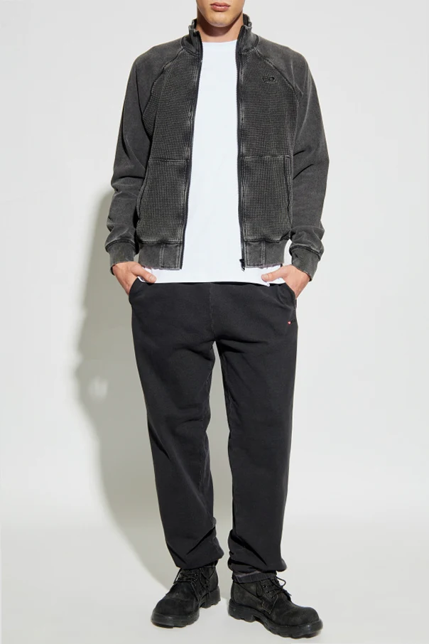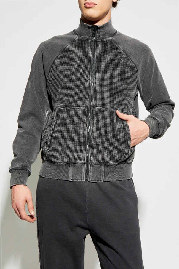 The front panel captivates with its distinctive, geometric waffle texture—juxtaposed elegantly against smooth, washed-back sleeves and rear—while the stand-up collar and flexible ribbed cuffs artfully complete the design. Impeccably crafted from premium cotton, its tactile structure and meticulously executed finishes evoke the legacy of Diesel: celebrated for quality and innovative flair since 1978.