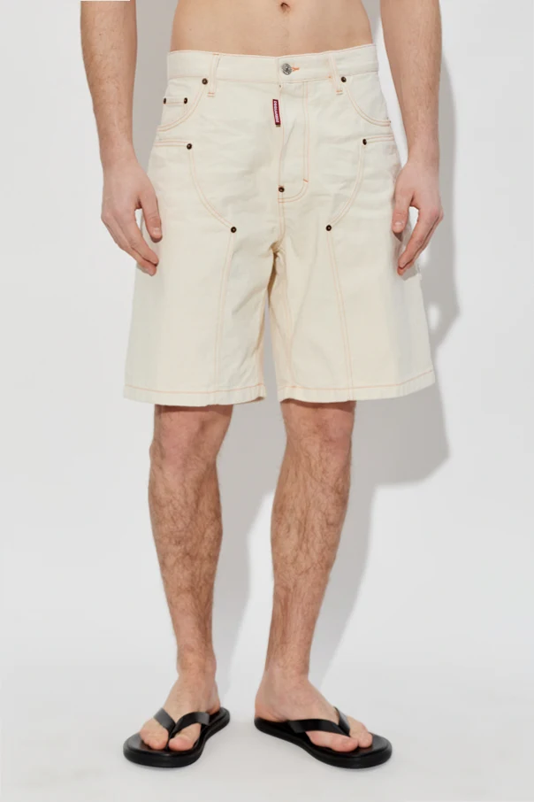 Immerse yourself in refined casual style with these Cargo Denim Shorts by Dsquared2 , skillfully crafted from premium cotton denim. Their classic, loose silhouette reaches the knee, accentuated by straight legs and a precisely defined cargo construction. The distinctive orange contrast stitching elegantly outlines the architectural design, lending a sophisticated edge to this otherwise minimalist, solid-blue ensemble.