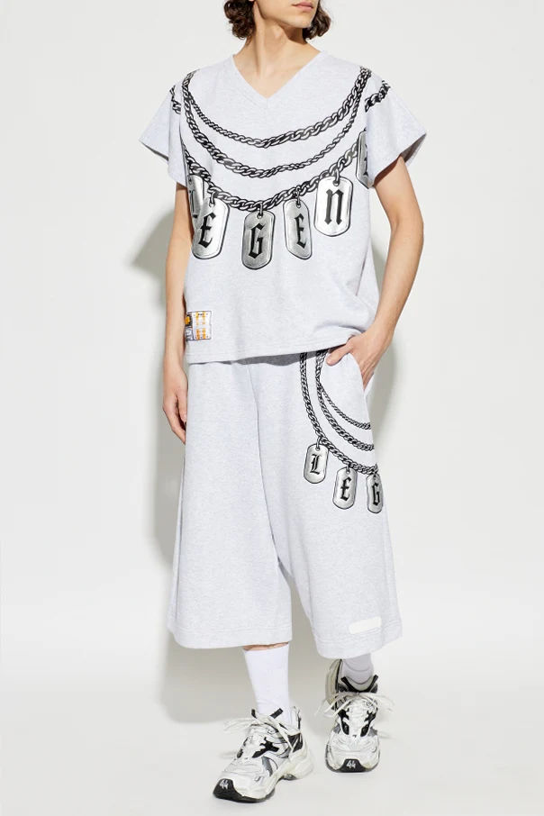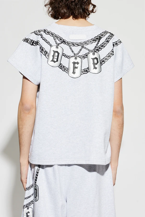 The centerpiece is an extraordinary 3D-printed chain motif that drapes around the neck—adorned with metallic-effect dog tags boldly spelling “LEGEN” at the front and “DFP” at the back, for a dramatic, multidimensional finish. An exclusive designer logo patch graces the lower left hem, underscoring the luxurious attention to detail that defines PDF.