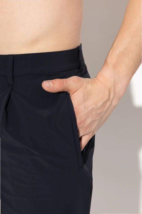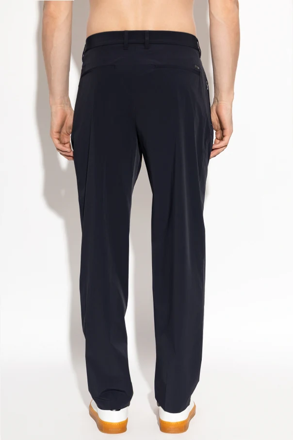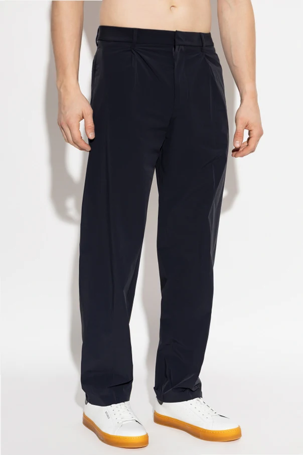 Immerse yourself in refined sophistication with these Emporio Armani tailored trousers in a timeless classic black hue. Crafted from a lustrous, impeccably smooth fabric, these trousers exude understated elegance and modern confidence. The expertly tailored silhouette features a pressed crease along each leg, gently tapering toward the hem to create a sleek, well-defined profile.