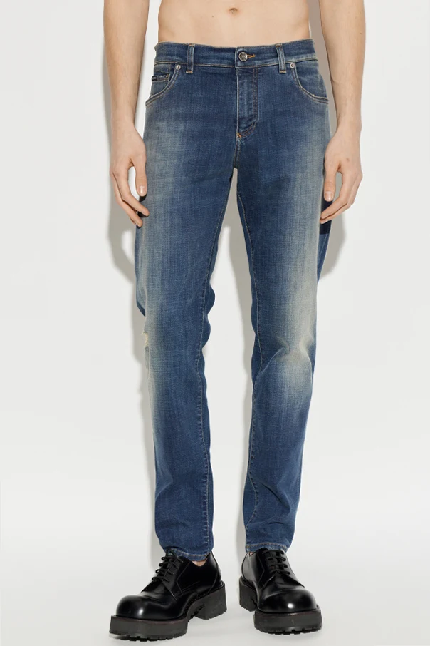 Elevate your wardrobe with these slim-fit jeans from the exclusive Dolce & Gabbana collection. Meticulously crafted from premium denim, these jeans feature a refined structure without added stretch, evoking an unmistakable classic allure. The deep navy blue hue, delicately enhanced by an artful faded effect and subtle lighter whiskering at the thighs and knees, imbues each pair with authentic character and modern distinction.