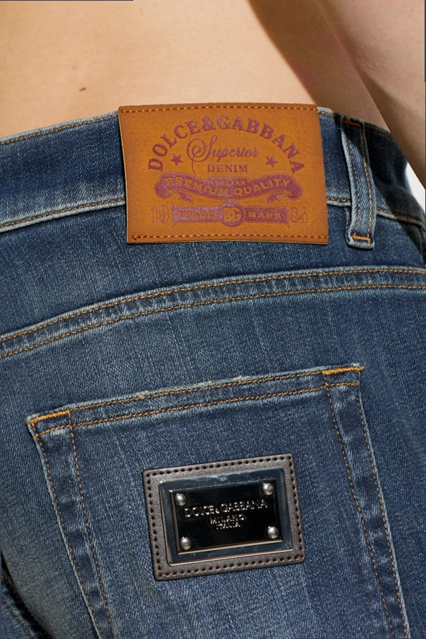 Distinguished details abound: a substantial brown leather patch embossed with the Dolce & Gabbana logo graces the back waistband, while a discreet metal plaque defines the rear pocket, subtly affirming their provenance. The tailored silhouette and slightly tapered leg ensure a sleek, contemporary profile synonymous with Italian luxury.