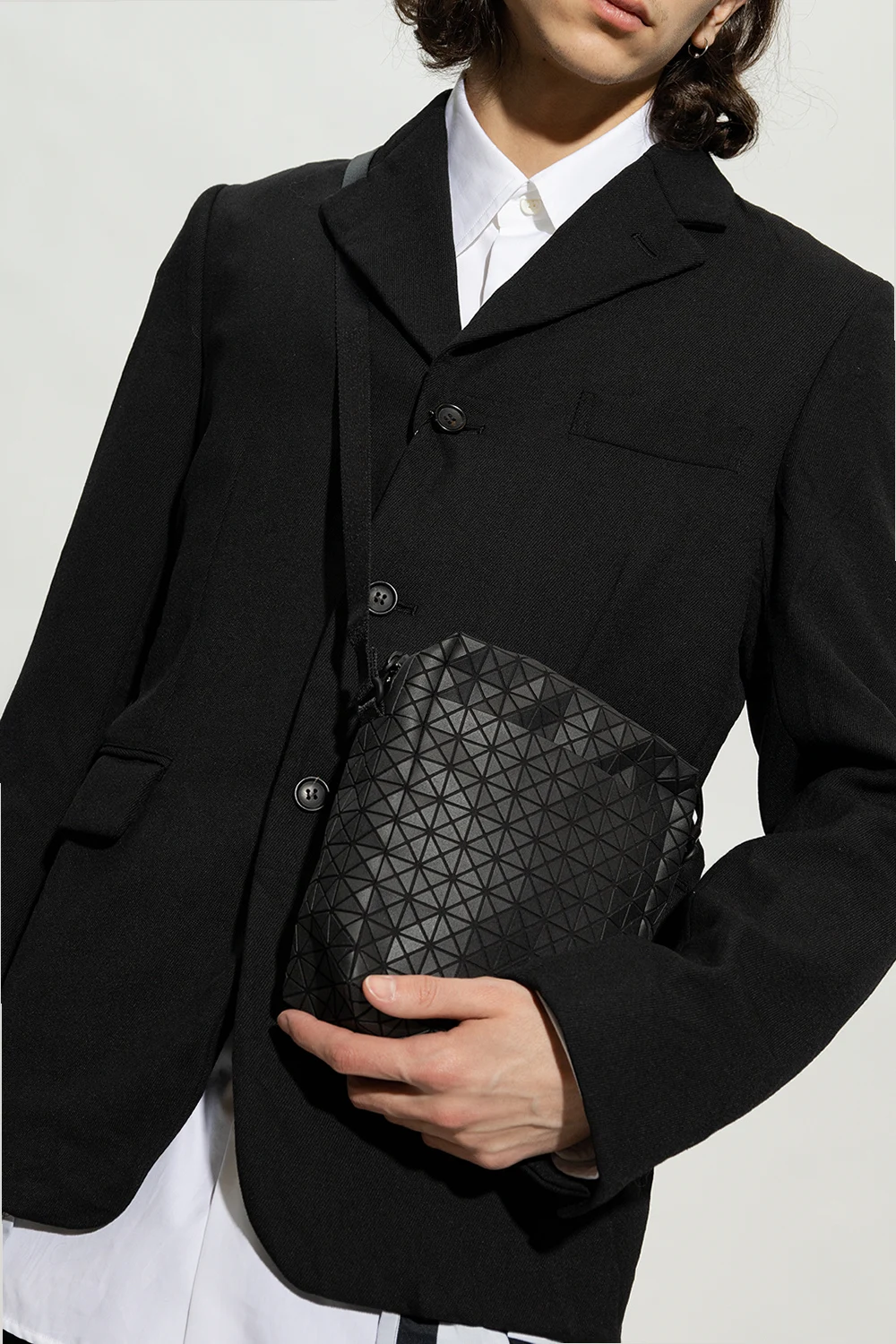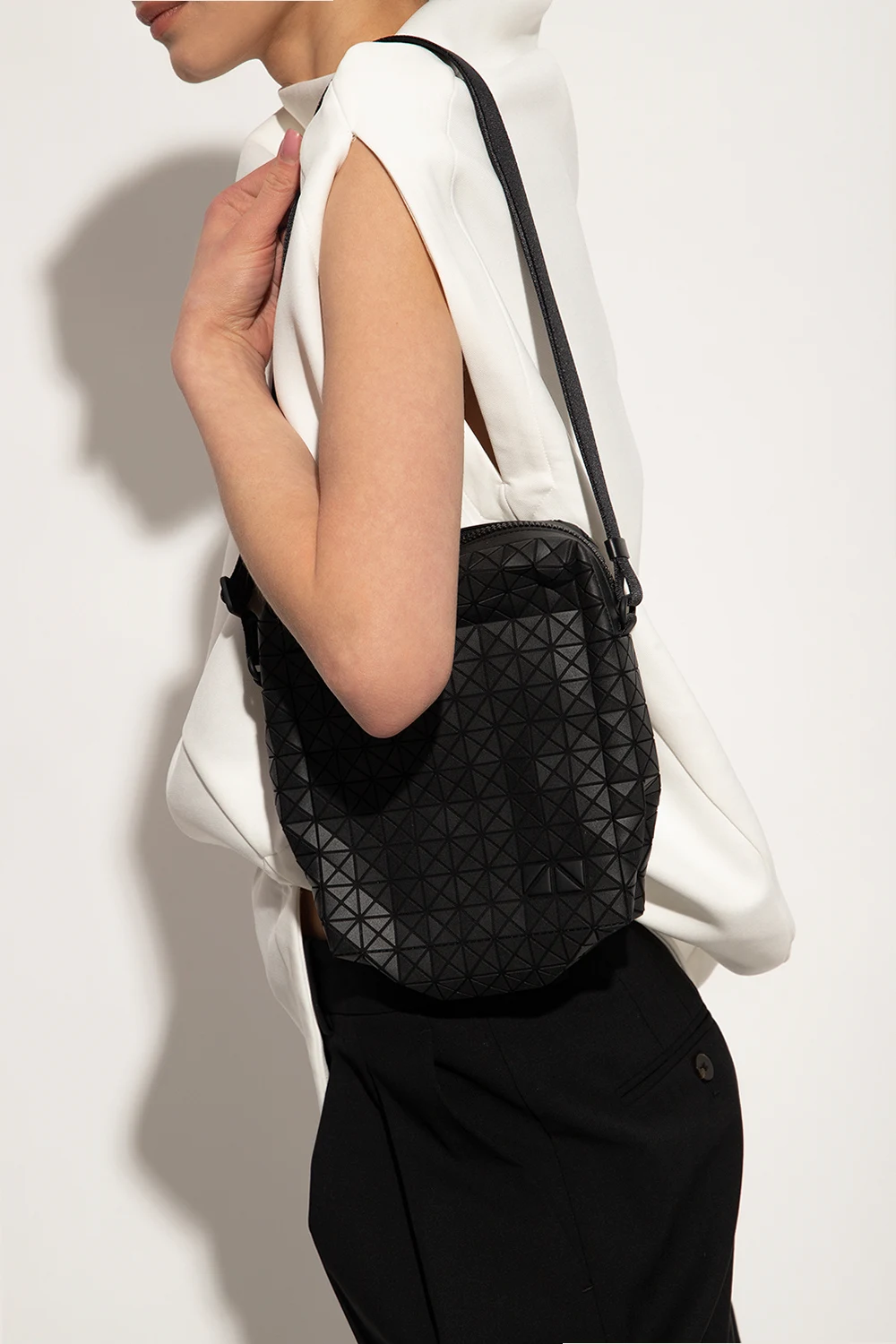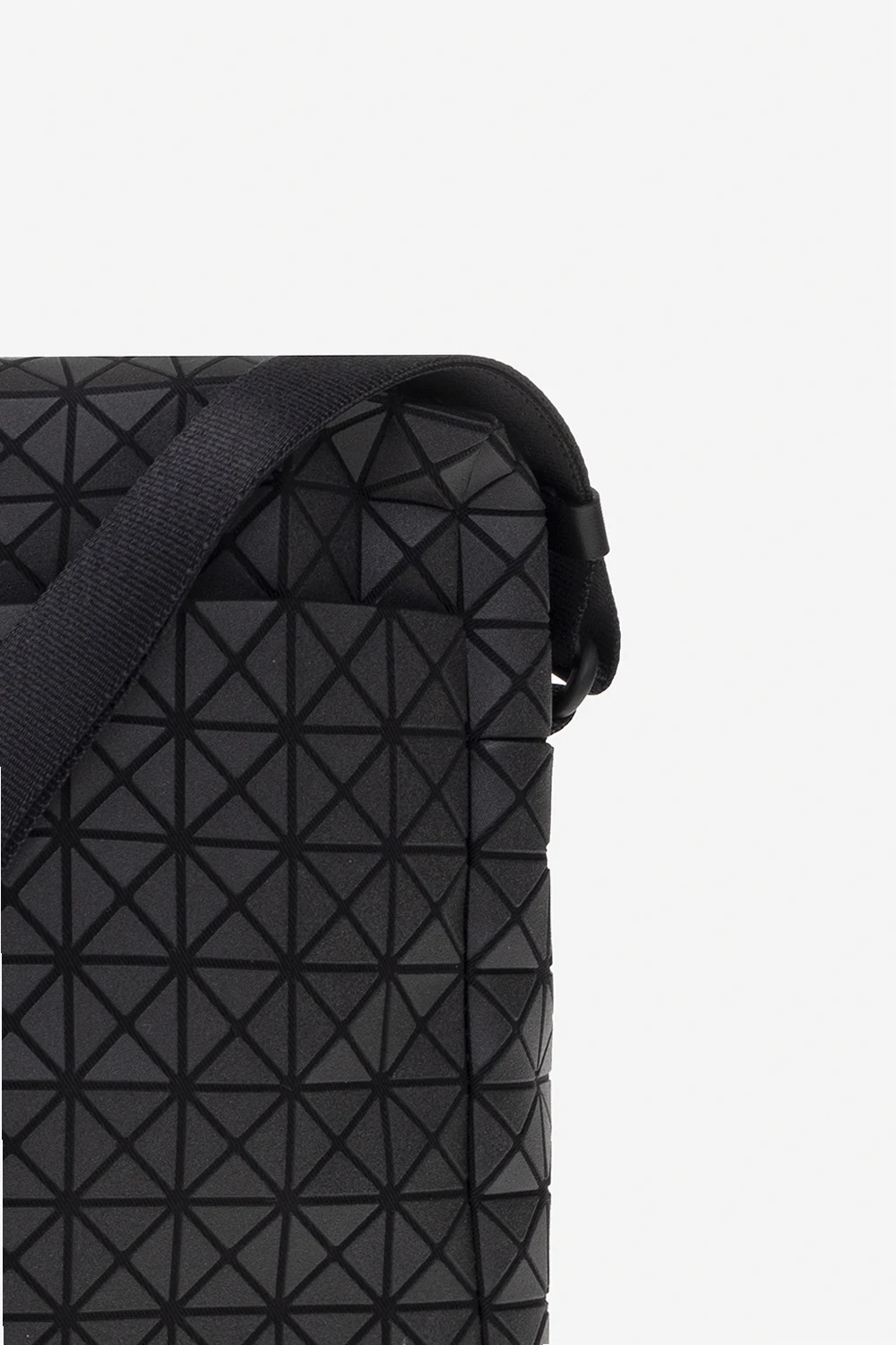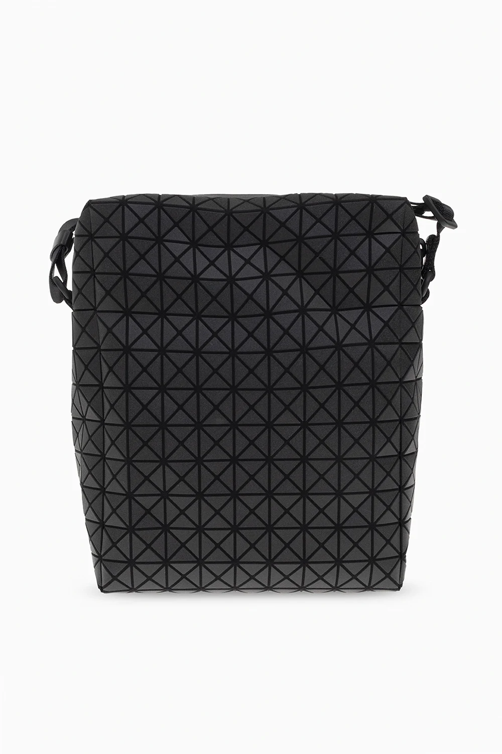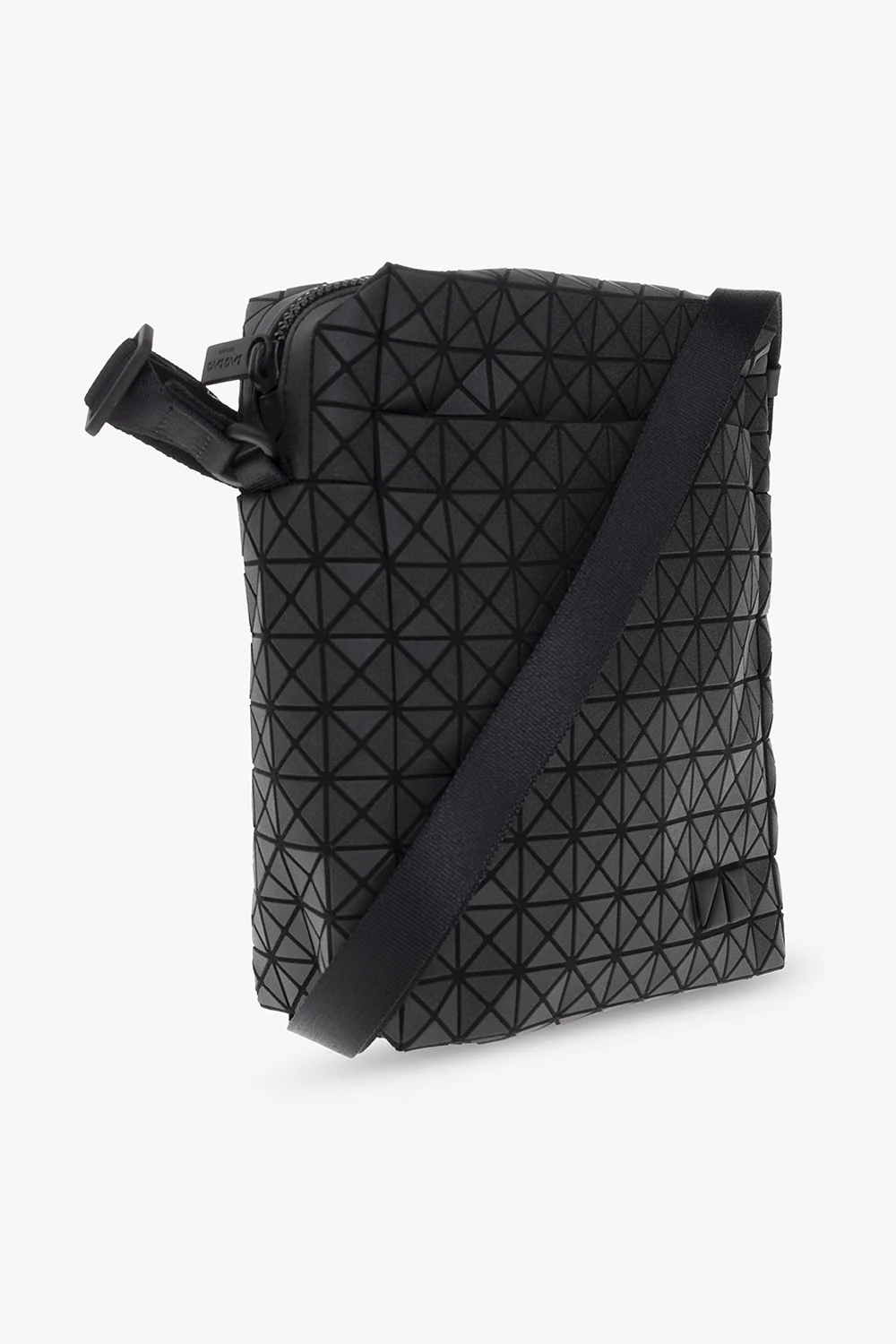 Black ‘Voyager’ shoulder bag from Issey Miyake Bao Bao. Crafted from cotton canvas with a series of rubber applications creating a geometrical pattern, this design fastens with a zipper and features a snap-fastened pocket on the front, an adjustable strap and one internal compartment with a slip pocket.
