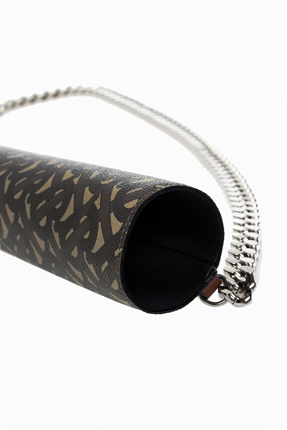 Brown and beige umbrella holder from Burberry. Made of leather, this design features a monogram pattern and adjustable shoulder strap with silver-tone chain inserts.