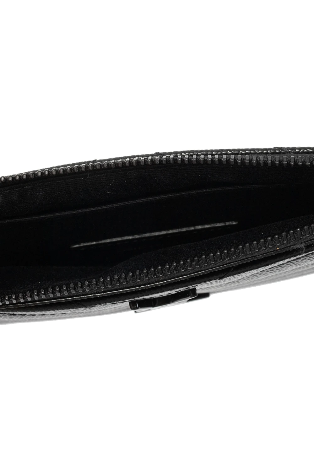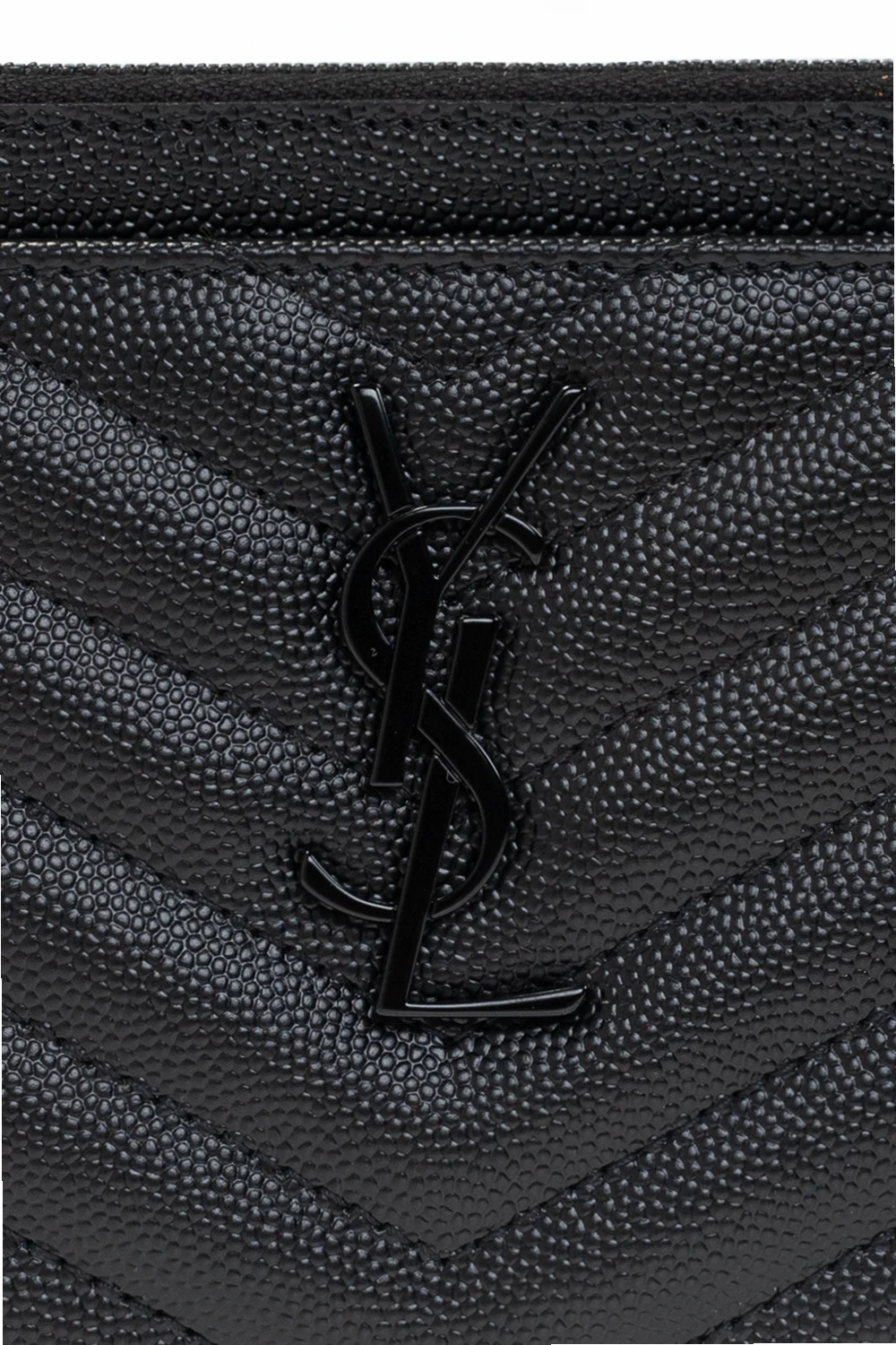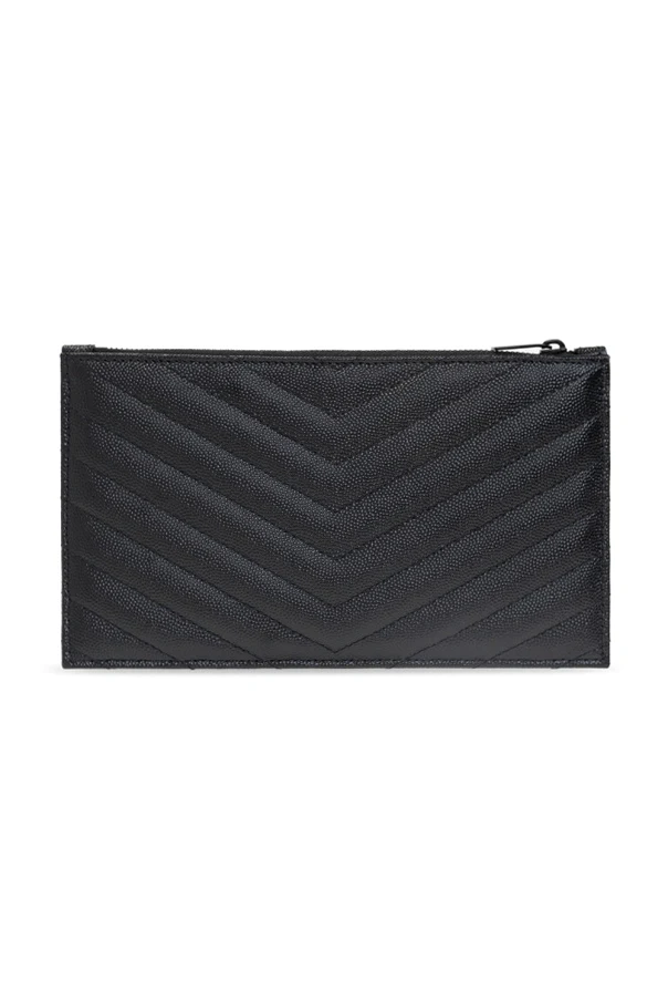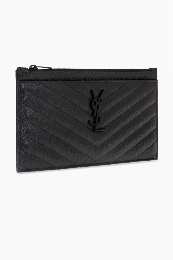 Black ‘Monogram’ quilted bill pouch from Saint Laurent. Crafted from calf leather, this item fastens via a zip and showcases metal YSL initials and a slip pocket on the front, black metal hardware and one internal compartment with a slip pocket.
