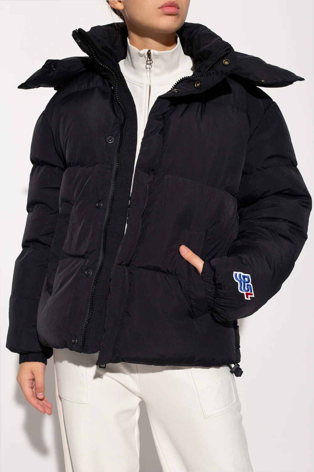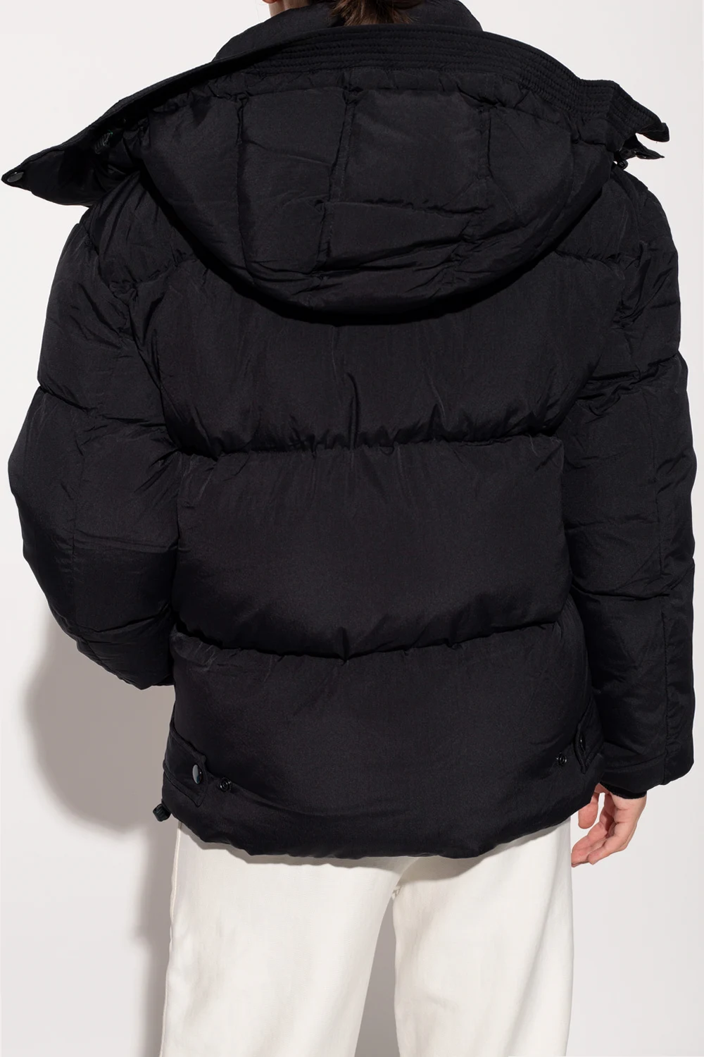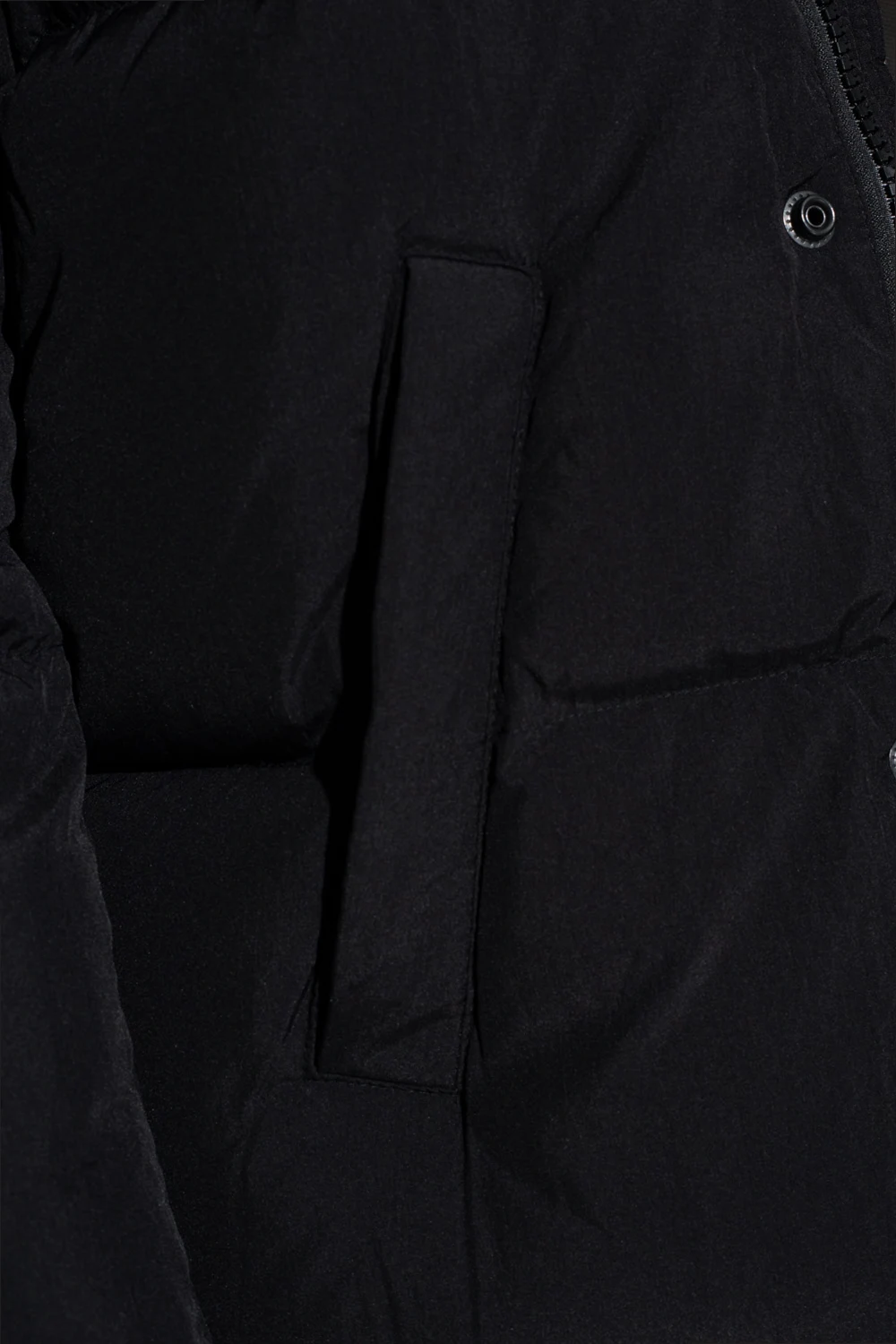 Black jacket from Diesel. Fastened with a zip and snaps, this garment features a blue, white and red logo patch, detachable hood, two snap-fastened pockets and drawstring hem.
