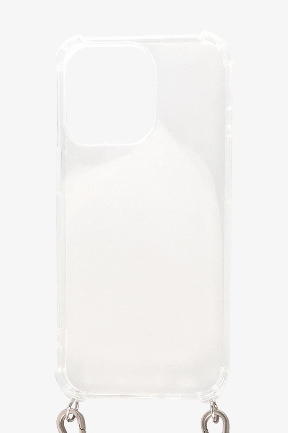 White, transparent iPhone 13 Pro case from 1017 ALYX 9SM. Decorated with a logo print, this design features a leather strap with the brand’s signature Rollercoaster buckle in silver-tone and gold-tone.