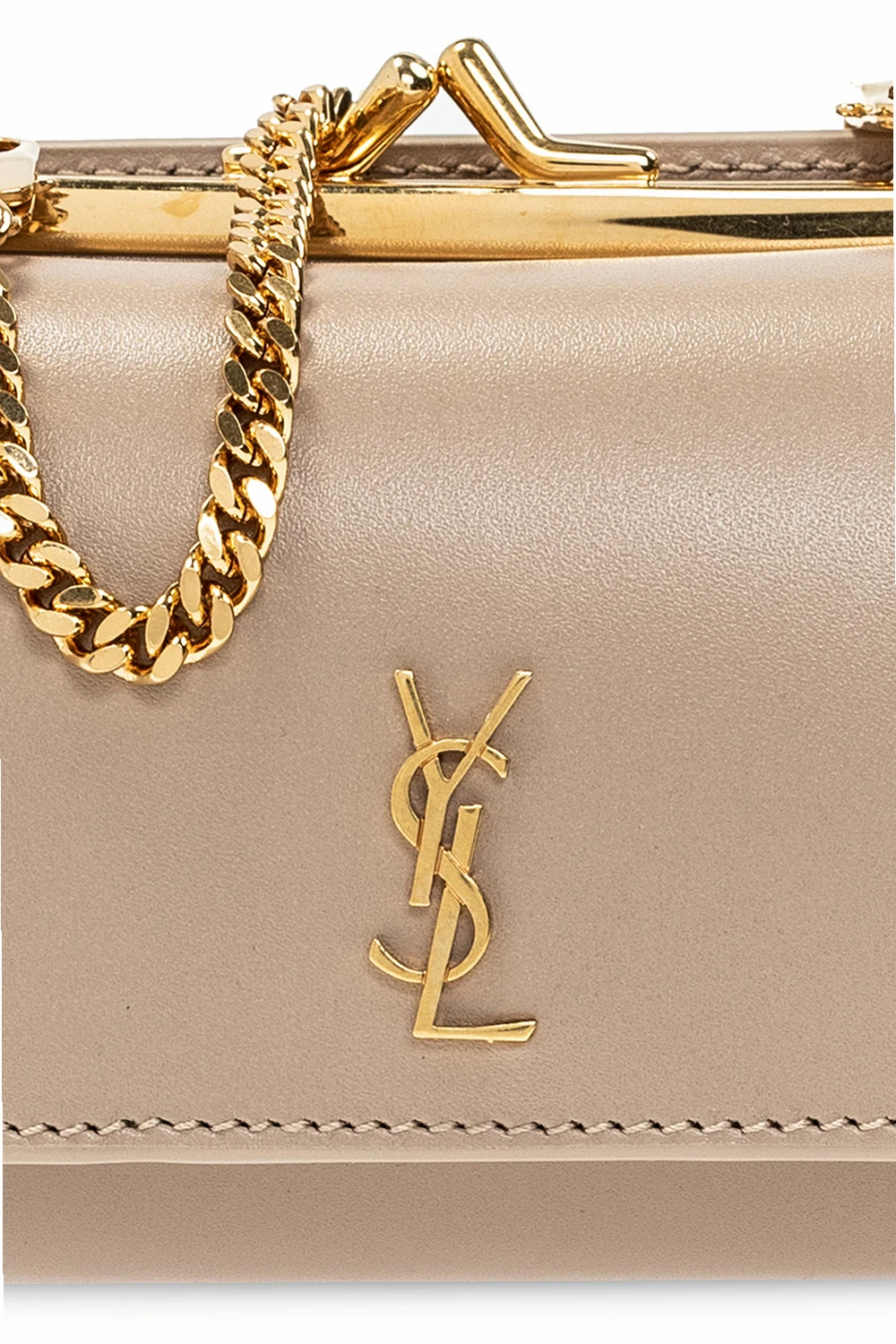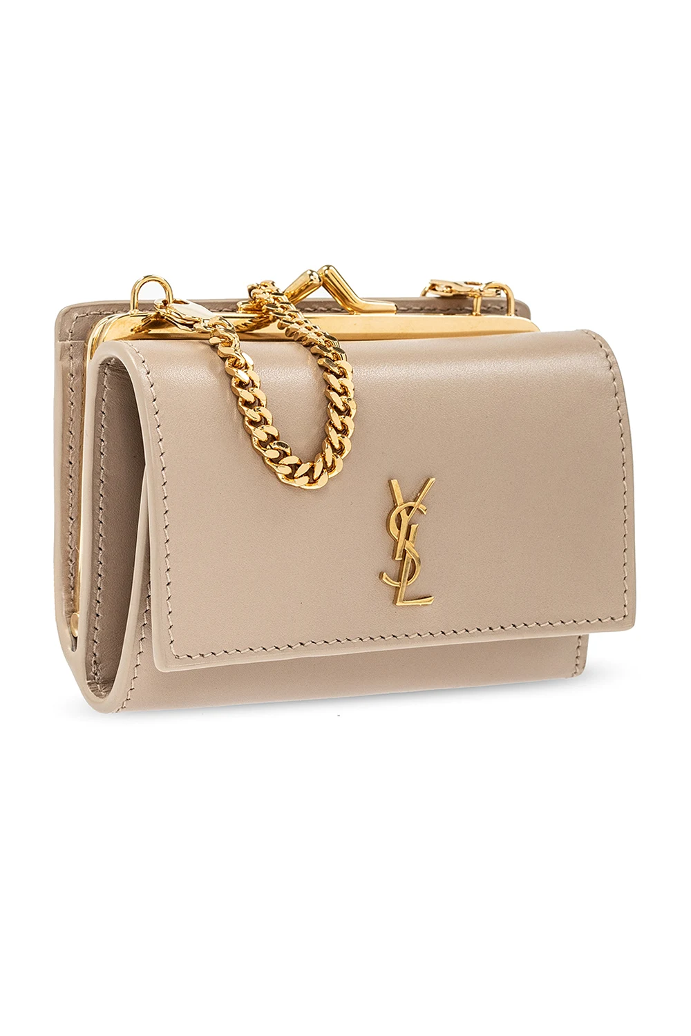 Beige ‘Rider’ belt bag from Saint Laurent. Made of calf leather, this design fastens via a snap and features a metal logo plaque on the front, a detachable chain strap , gold-tone metal hardware, a snap-fastened coin pocket and a bill compartment and three card slots inside.