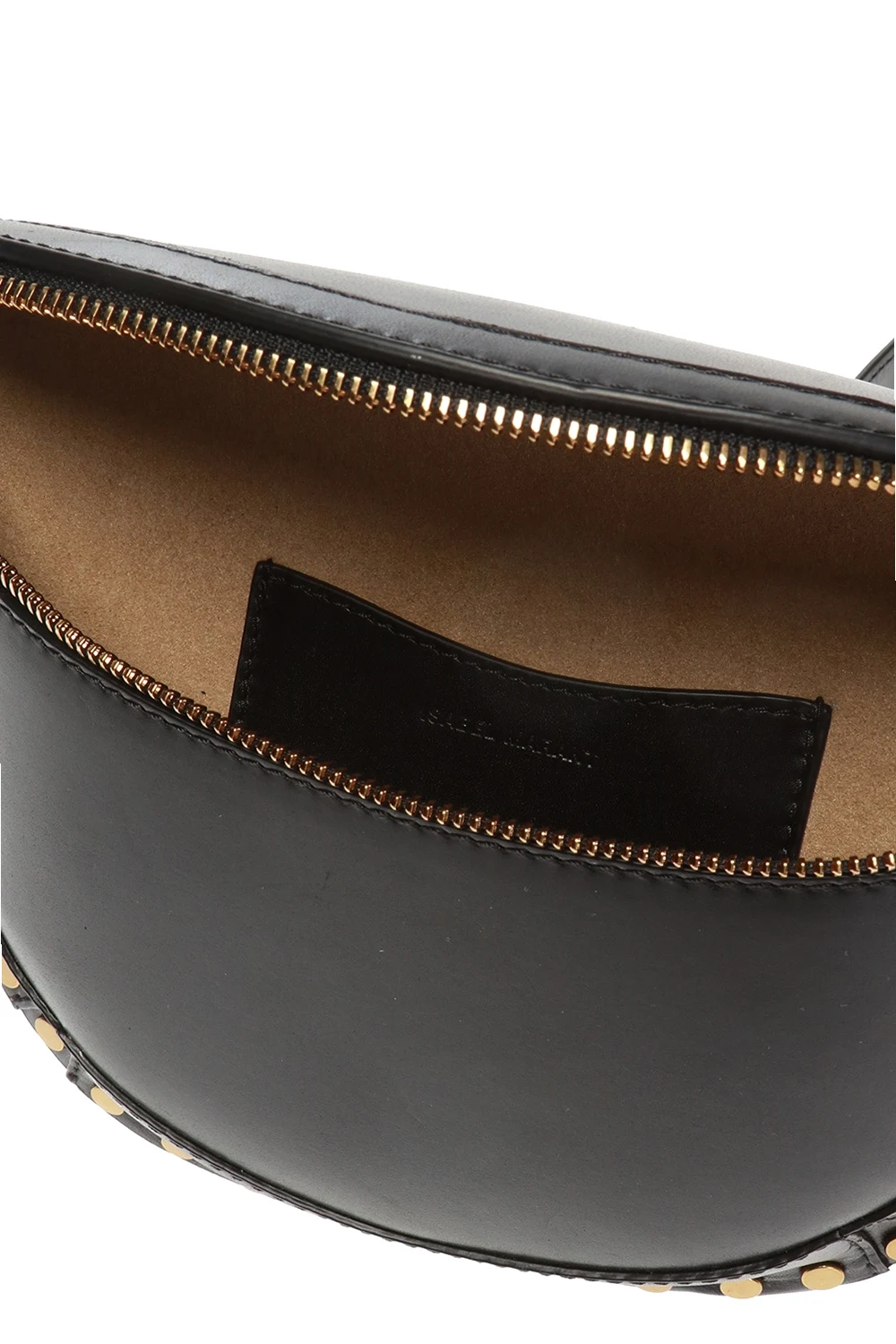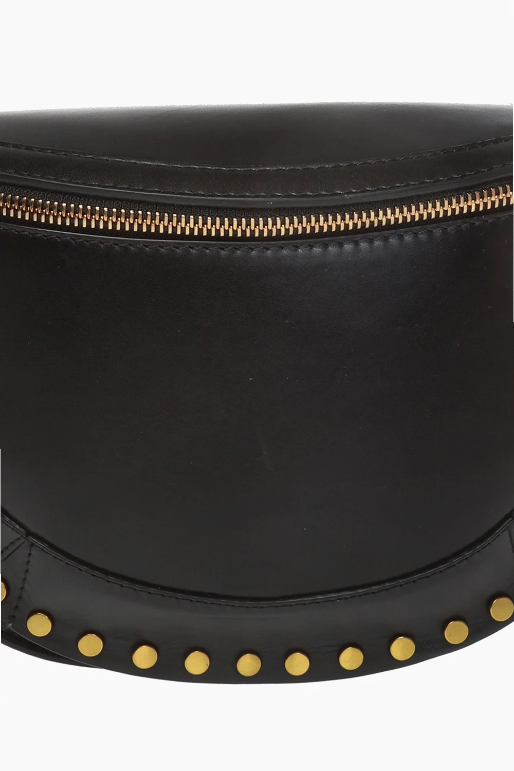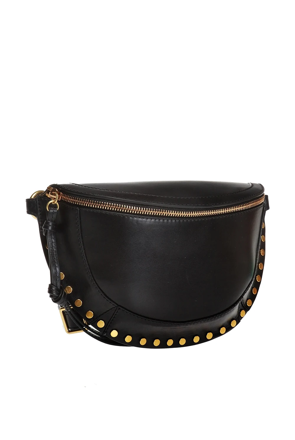 Black 'Skano' belt bag from Isabel Marant. Made of cow leather. Fastened with zip. Embellished with antiqued gold-tone studs. It features logo-embossed slip pocket on the rear, an adjustable waist belt and interior with 1 compartment and beige lining inside.