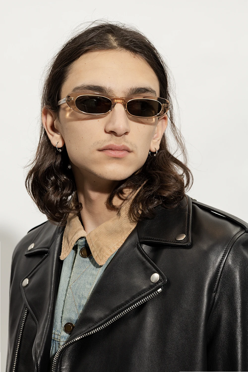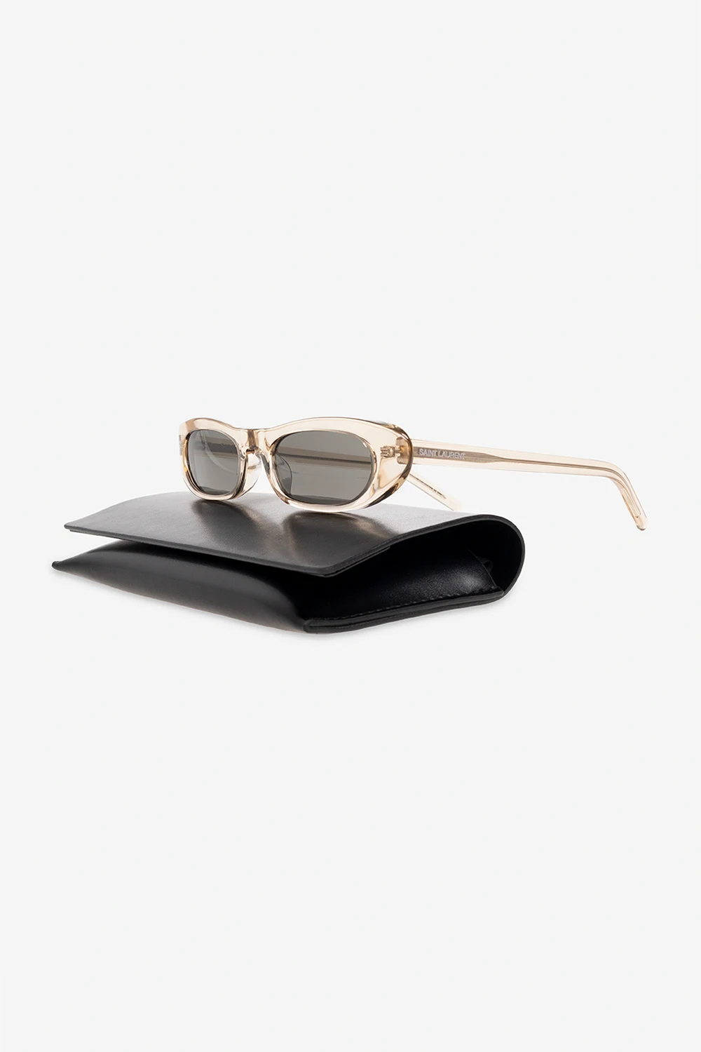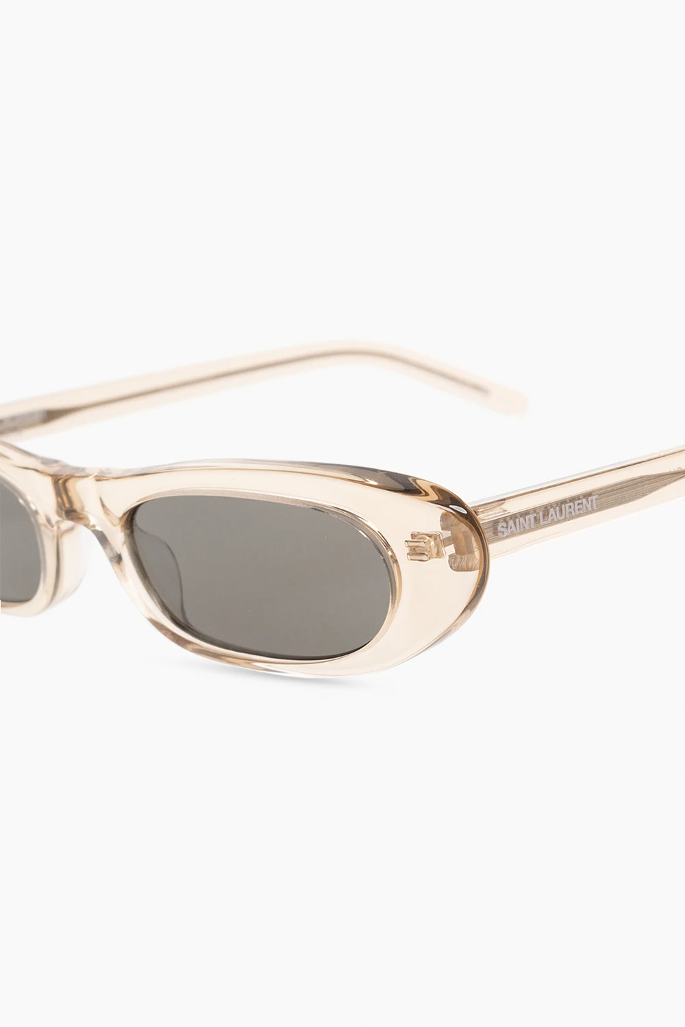 Cream ‘SL 557 SHADE’ transparent sunglasses from Saint Laurent. Flaunting rectangular cat-eye design, this model features white logo detailing on the temples and grey lenses with 100% UVA/UVB protection. Case included.