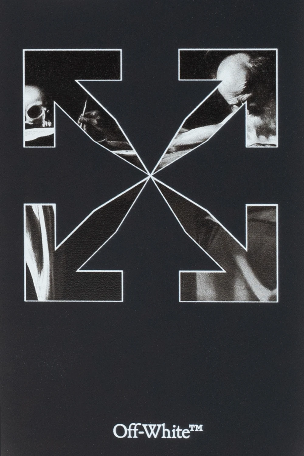 Black iPhone 12/12 Pro case with a logo and a pattern from Off-White.