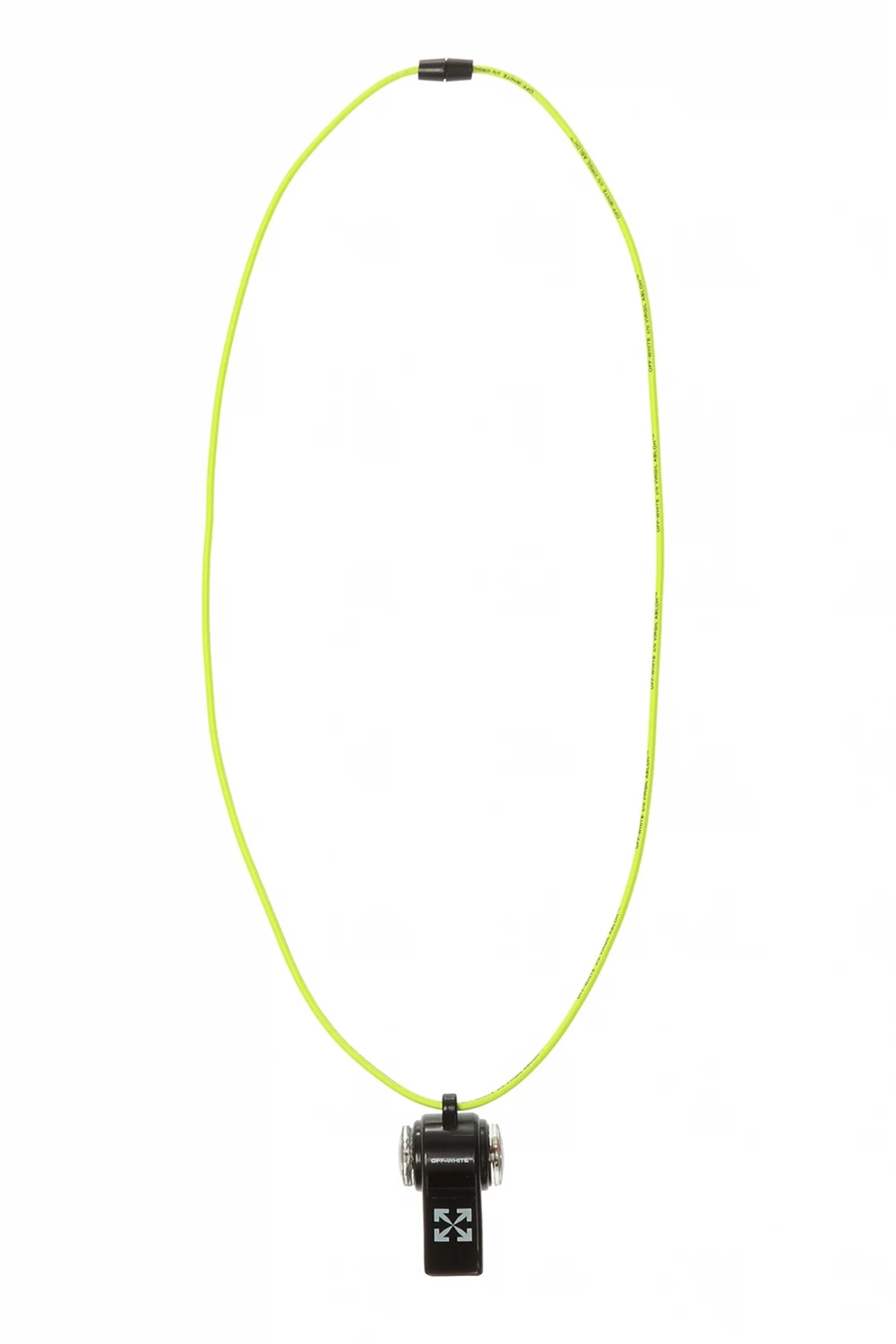 Black whistle with compass and thermometer from Off-White. Comes with neon green strap.