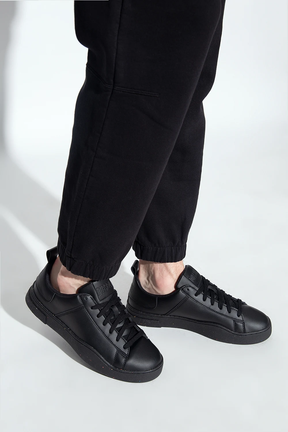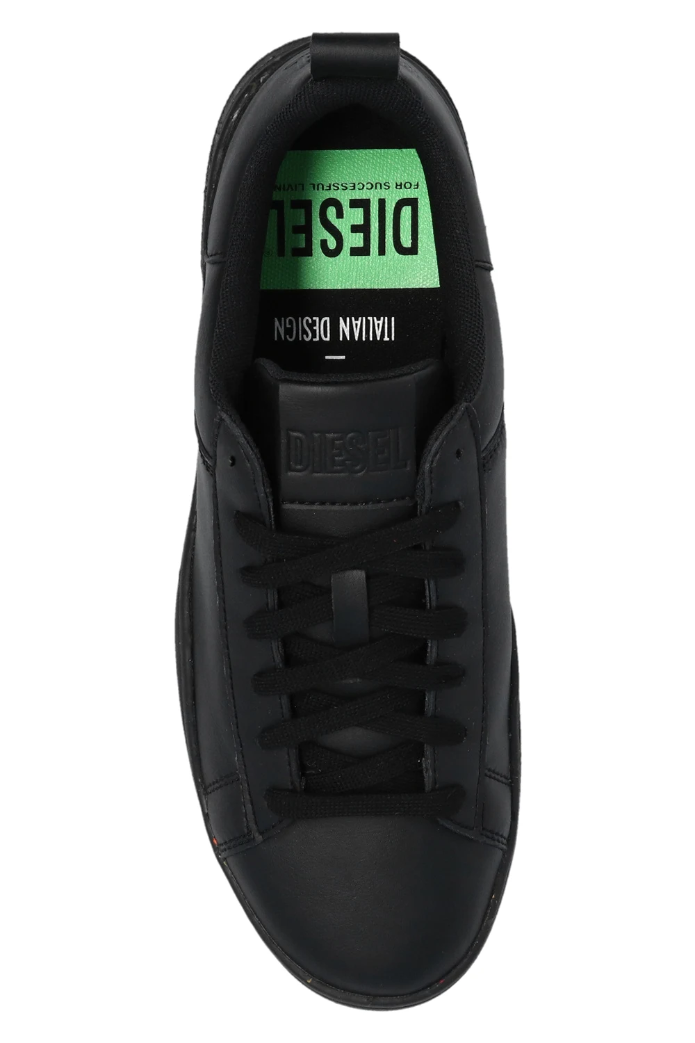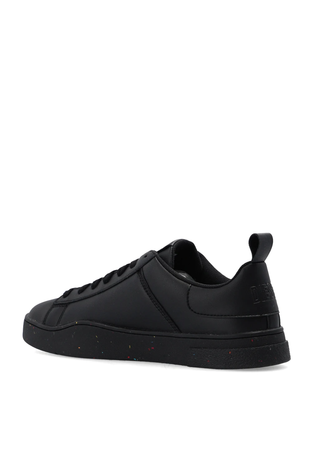Black sneakers from Diesel. Made of leather and rubber, this lace-up pair rests on a black rubber sole and is enriched by a logo pattern and multicolored inserts.