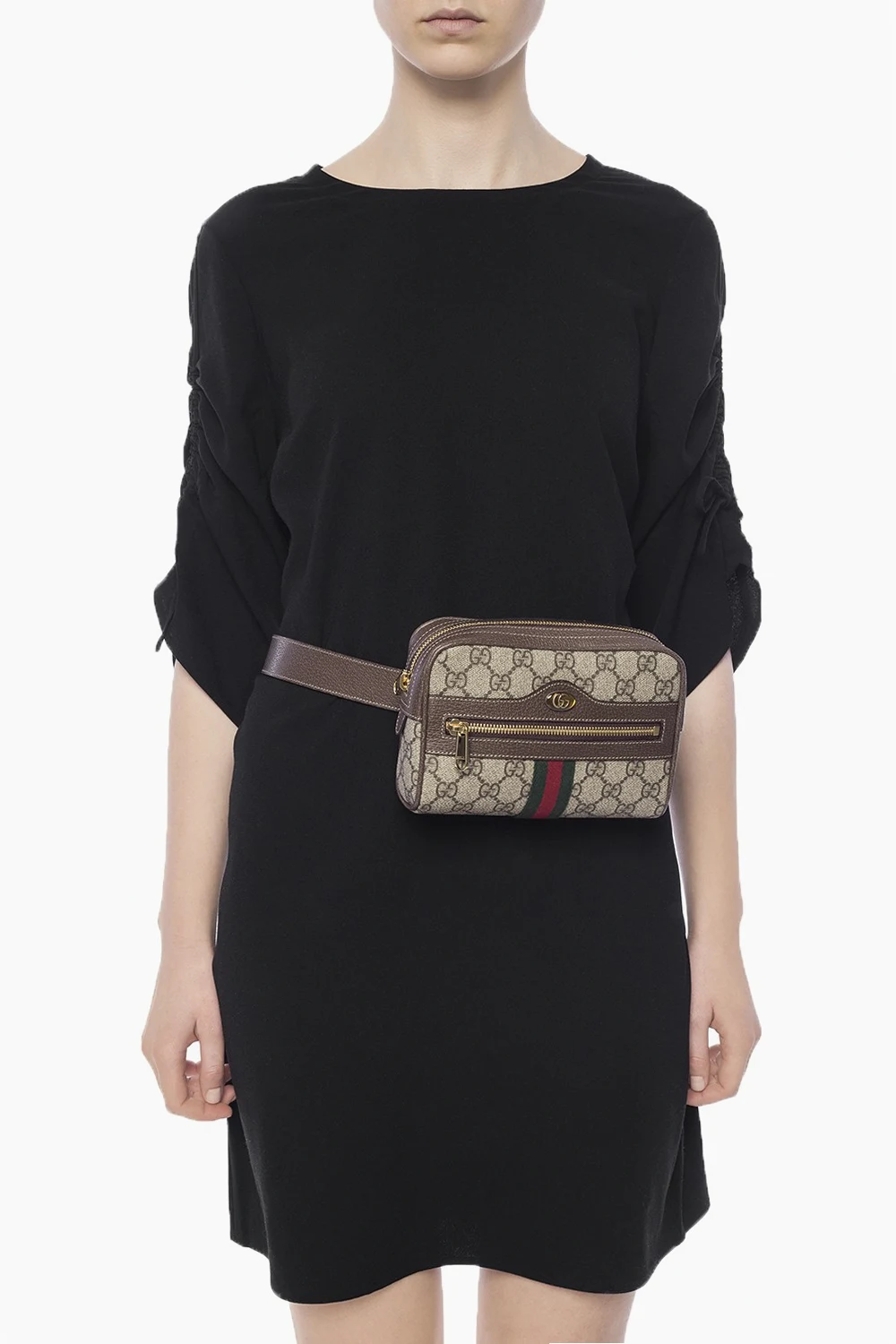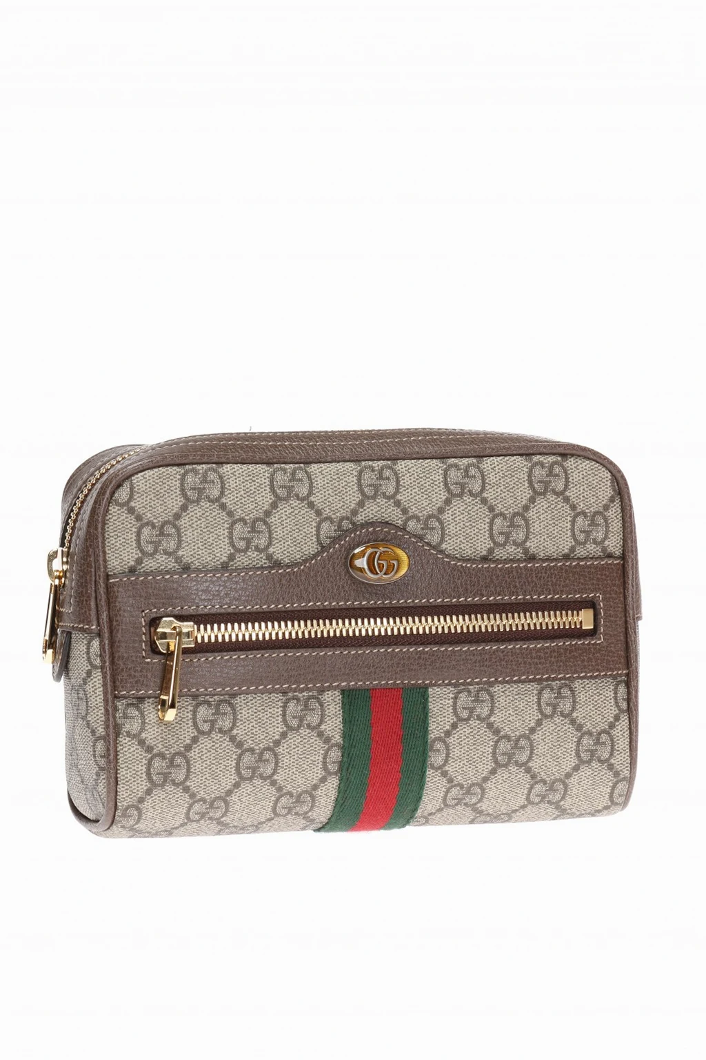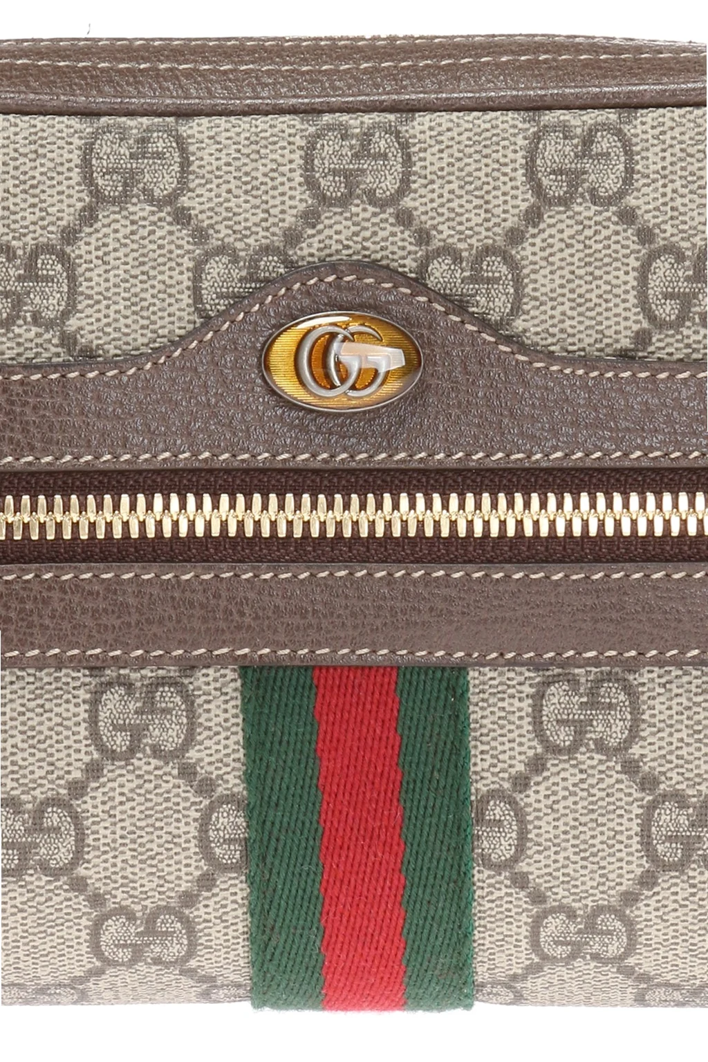 Beige and brown 'Ophidia' belt bag. Size small. Made of signature 'GG Supreme' canvas. Zip fastening. Orange and silver-tone logo element. Green, red and green signature 'Web' strap. Zip pocket at front. Brown leather trimming. Adjustable and detachable strap. Beige suede interior. 1 compartment with 1 slip pocket inside. Gold-tone metal hardware.