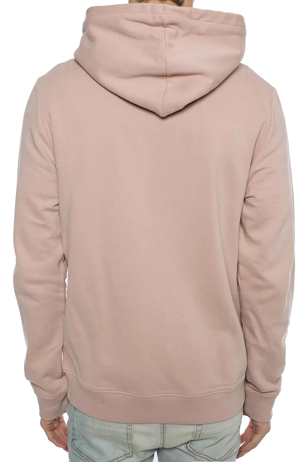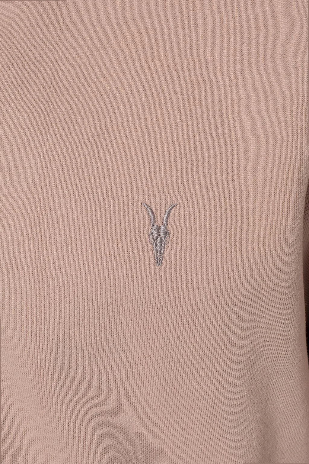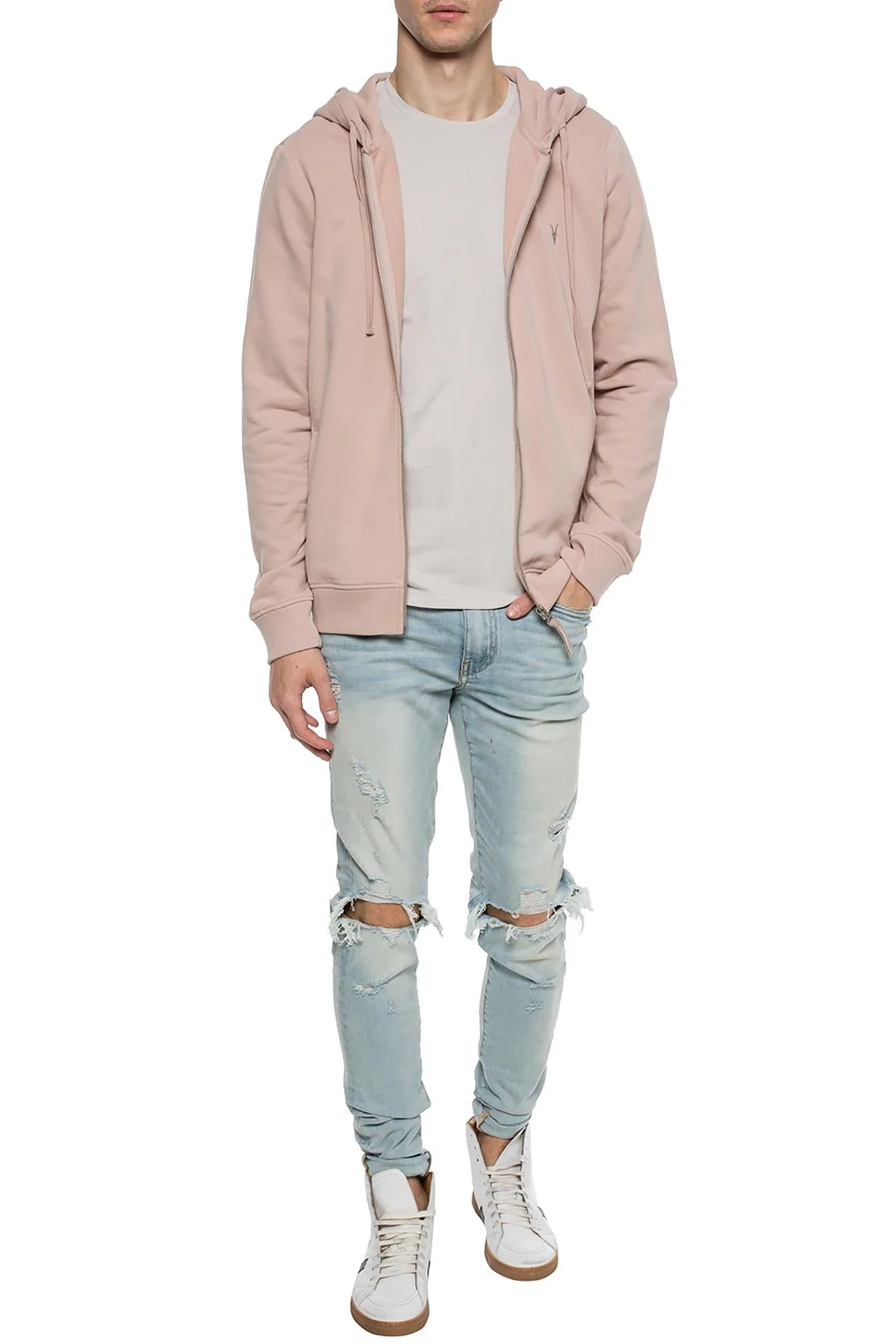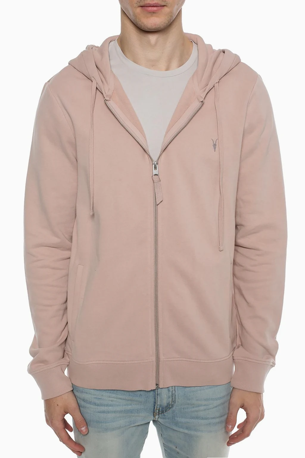 Light pink 'Raven' sweatshirt with a drawstring hood from AllSaints. Made of cotton. Fastened with zip. Enriched by embroidered grey Ramskull on the chest. Also features 2 slip frontal pockets and a ribbed bottom hem and cuffs.