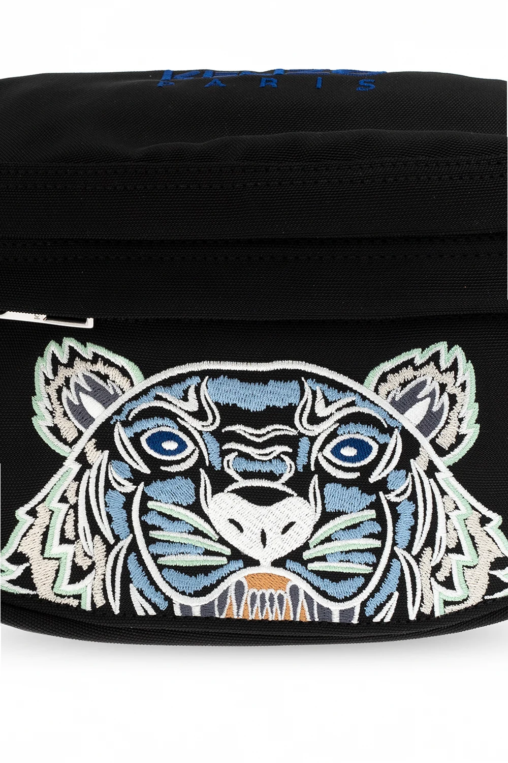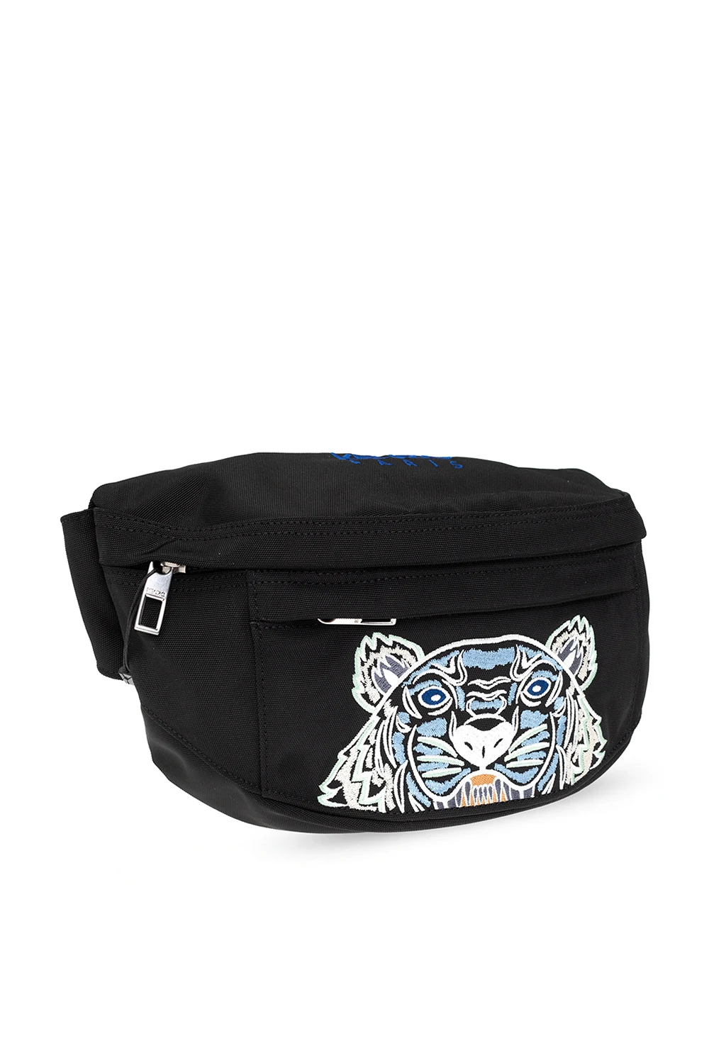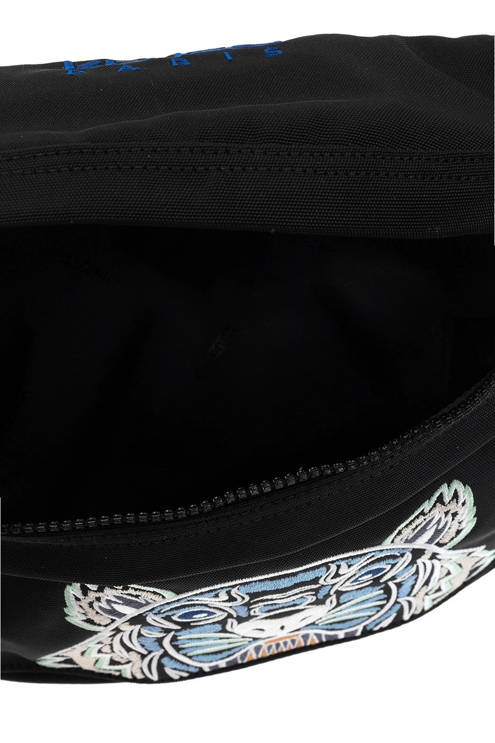 Czarna torba na pas, model ‘Kampus’ Kenzo. Wykonana z płótna. Zamykana na zamek. Ozdobiona wyszytym logo i kolorową, charakterystyczną głową tygrysa. Z przodu i z tyłu kieszeń zamykana na zamek. Regulowany pas. Wewnątrz komora.