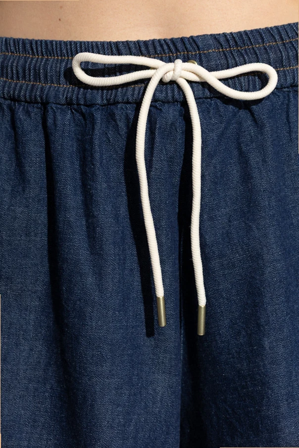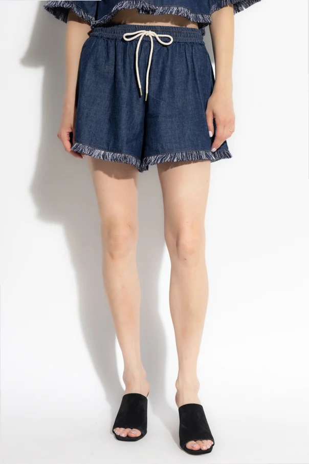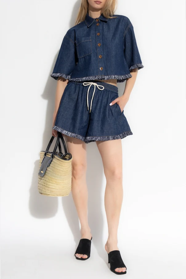 Jeansowe szorty z frędzlami od mistrzyń subtelnego stylu, sióstr marki Zimmermann, to kwintesencja nieformalnej elegancji. Wykonane z wysokogatunkowego, granatowego denimu, emanujące lekkością oraz komfortem, zachwycają nieprzylegającym krojem z delikatnie rozkloszowanymi nogawkami. Swoboda ruchu zostaje podkreślona przez elastyczny ściągacz w pasie z efektownym, białym sznurkiem wykończonym złotymi detalami.